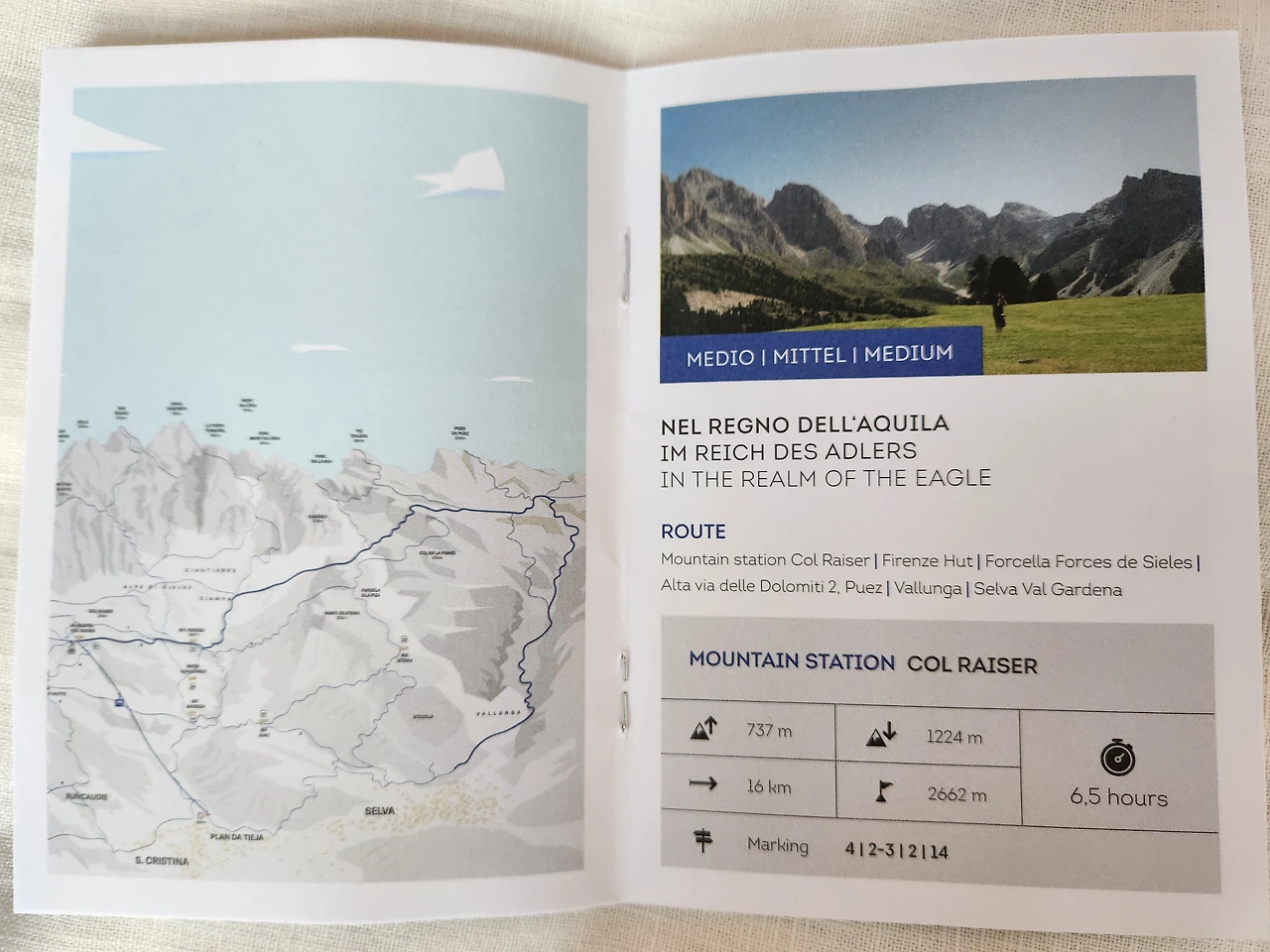 트레일 경로 : Col Raiser Top Station (2106 m) – Rifugio Firenze (2037 m) – Forcella Piza (2489 m) – Rifugio Stevia (2312 m) – Forcella Piza (2489 m) – Col dala Pieres (2747 m) – Forcella Forces de Sieles (2505 m) – Rifugio Firenze (2037 m) – Col Raiser Top Station (2106 m).