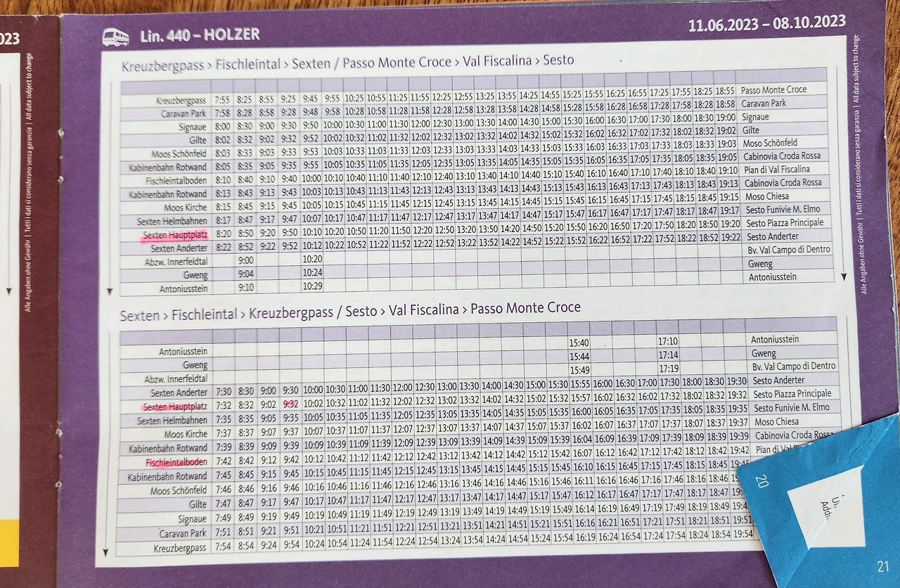 쎄스토 지역 440번 버스시간표. 호스트가 필요한 부분을 접고, 형광펜으로 표시해서 주었다.