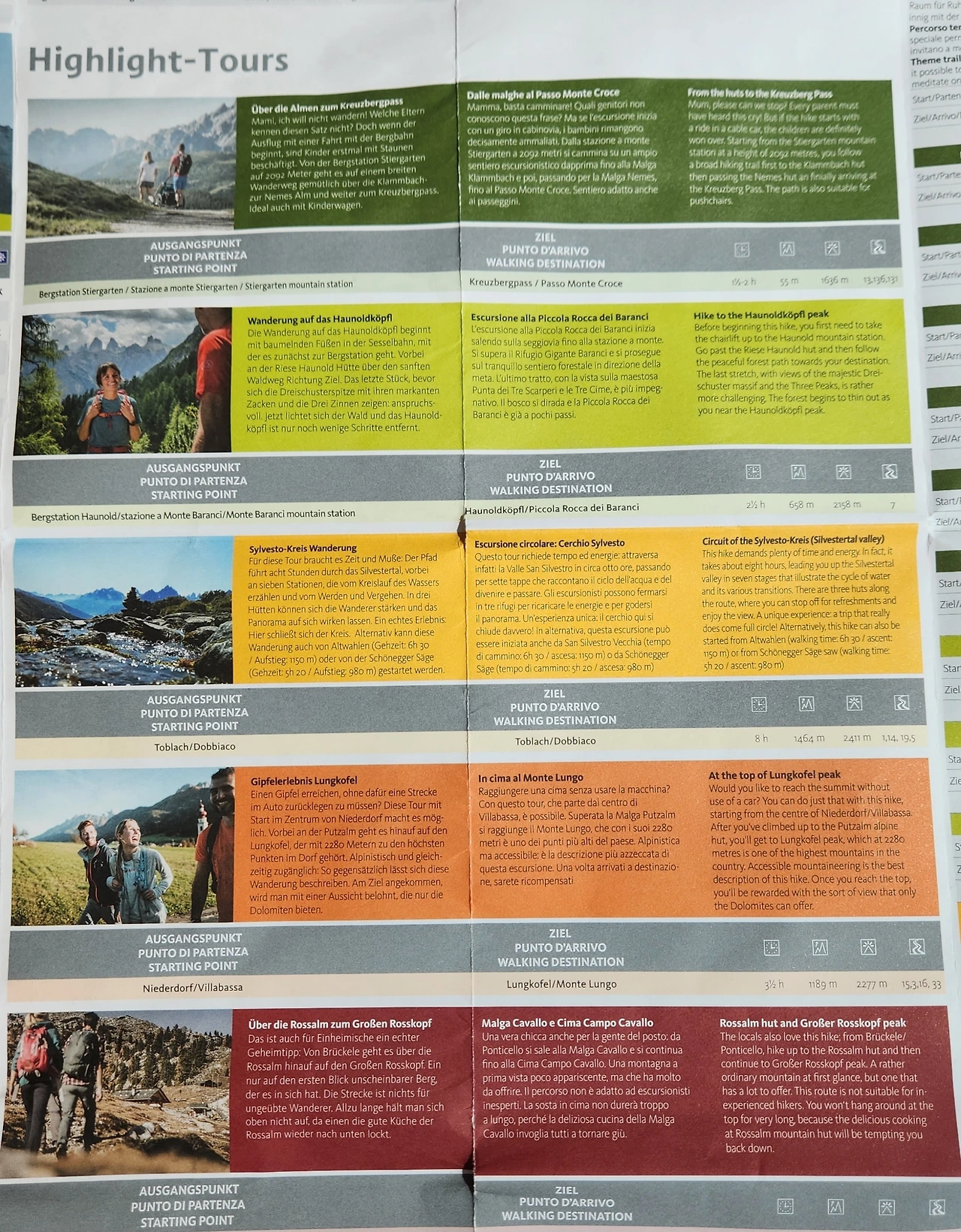 124번 트레일을 따라가다가 Prati di Croda Rossa/Rotwandwiesen까지 153번 트레일을 따라갑니다. 1시간 10분 정도 올라가면 Croda Rossa/Rotwand 목초지가 나옵니다. 산장에서 식사를 하거나 차를 한 잔 마시며 충분히 경치를 즐기신 후 트레일 15/15a를 따라 Passo Monte Croce/Kreuzbergpass로 내려오면 440번 셔틀버스를 탈 수 있습니다.