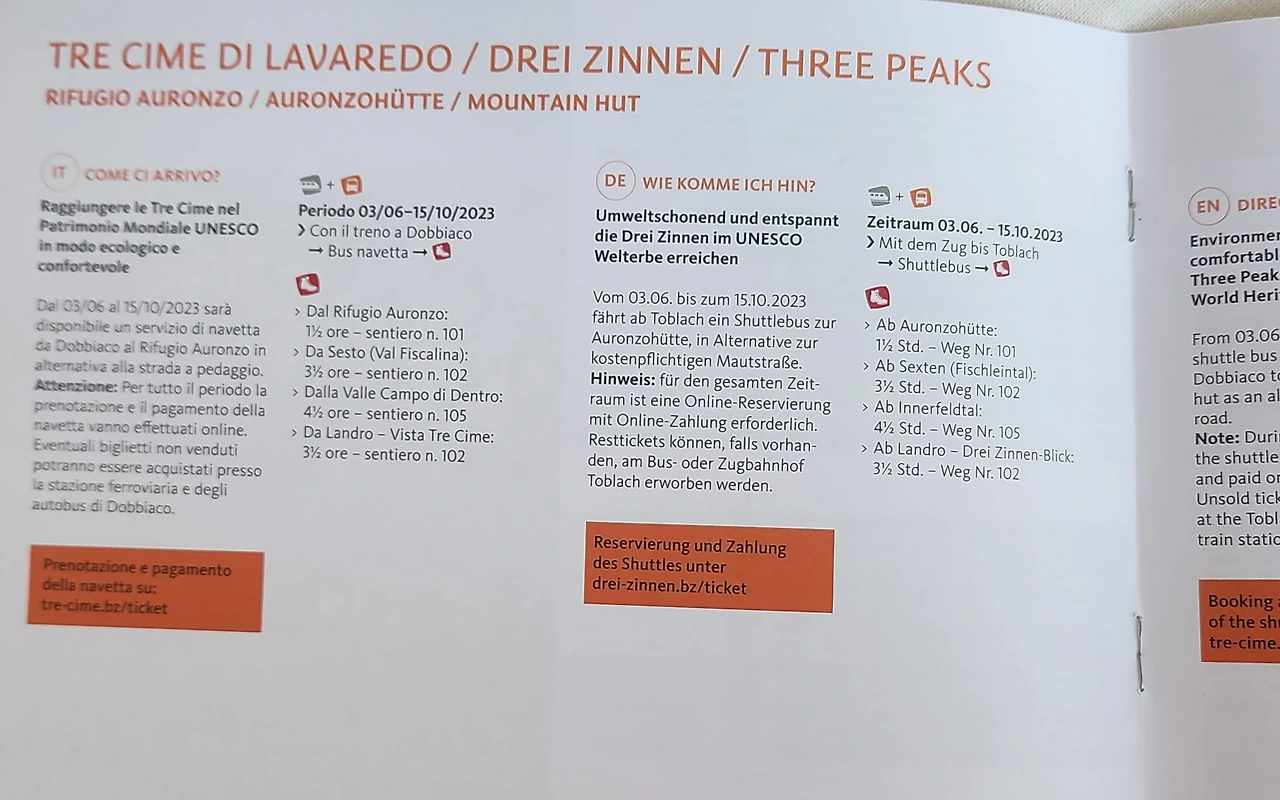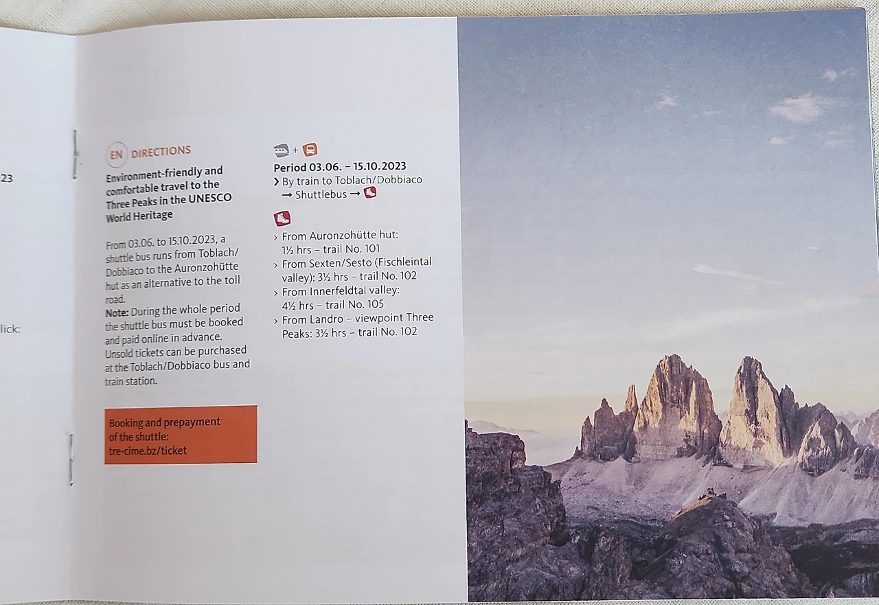 이곳은 오르티세이나 코르티나 담페초에 비해 덜 알려져 있다보니 지도나 브로슈어 등을 정말 다양하게 많이 비치해 놓고 있었습니다. 이 지역도 케이블카나 리프트를 타고 산에 오른 후 편하게 트래킹을 즐기실 수 도 있고, 트레치메 라바레도 까지 걸어서 가실 수도 있습니다. 교통도 편리합니다. 이곳에서 도비아코까지는 버스로 20분이고, 도비아코에서는 브라이에스 호수와 아우론조 산장으로 가는 버스를 타실 수 있습니다.