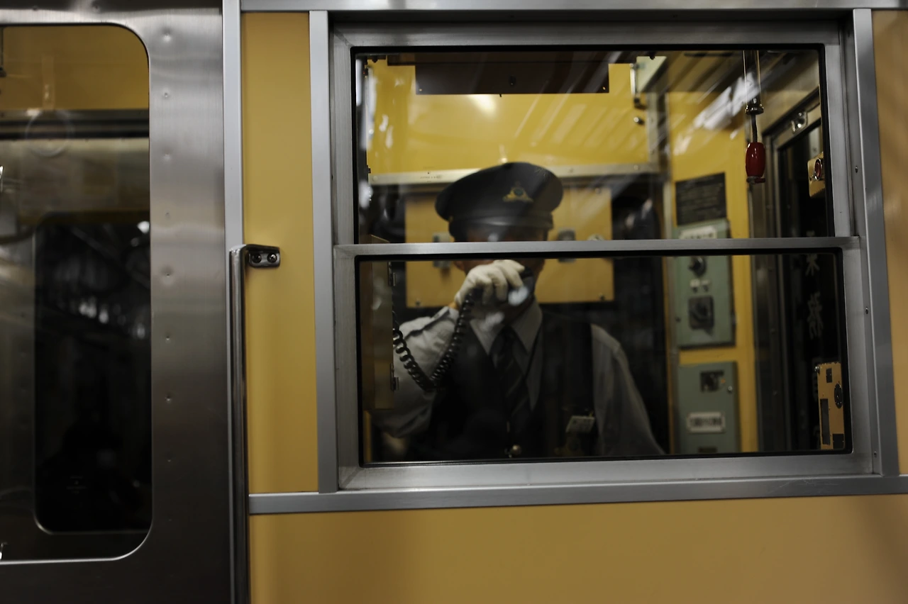 일본 도쿄 JR선 객차 기관사가 지하철의 출발을 알린다. 목소리에 어떤 설레임이나 기쁨을 찾아볼 수 없다.