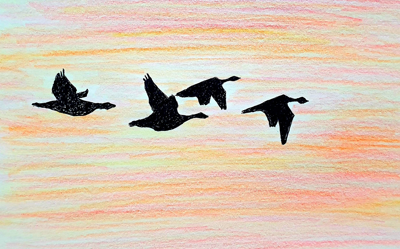 만약 한 마리라도 기러기가 대열에서 이탈하면 그만큼 틈이 생겨 대기의 저항력을 느끼게 된다.