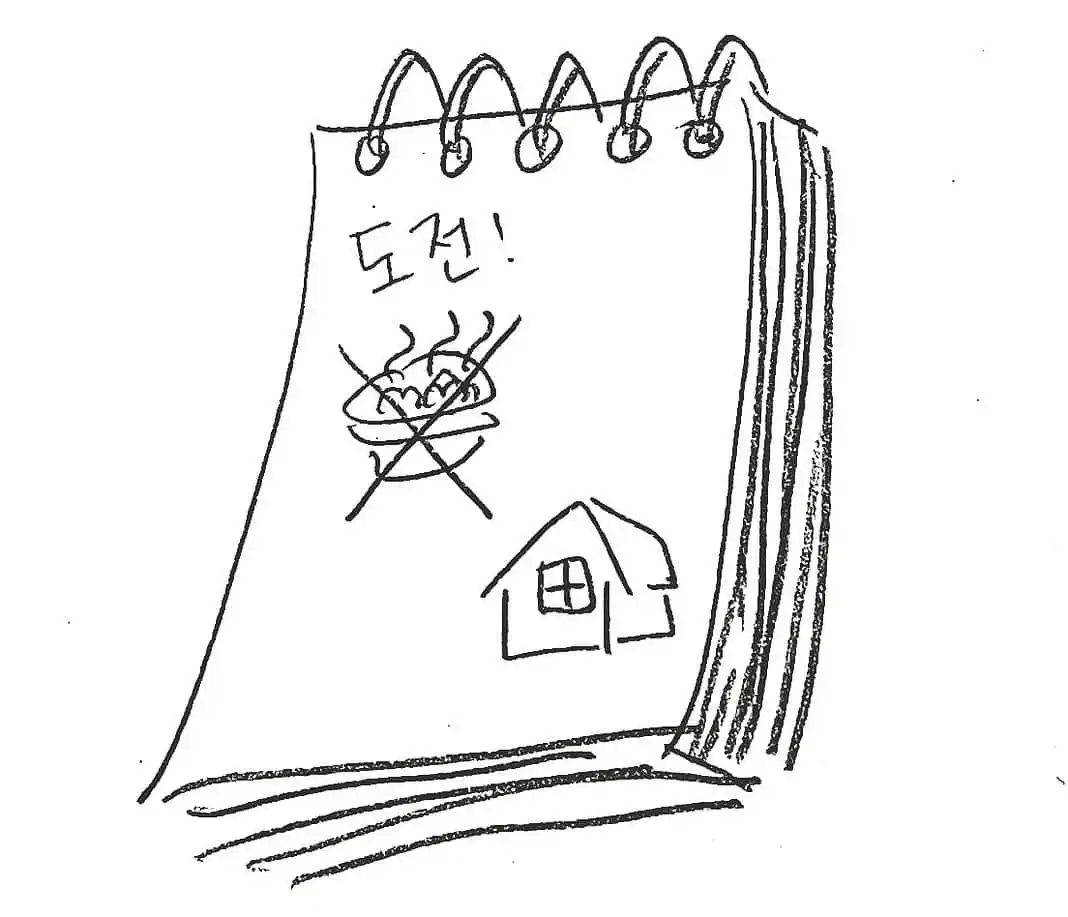 ▲스프링 노트에 집과 국밥 그림이 있는데, 국밥 그림 위에 X 표시가 되어 있고 그 위에 도전!이라고 쓰여 있다. ⓒ김소하 작가