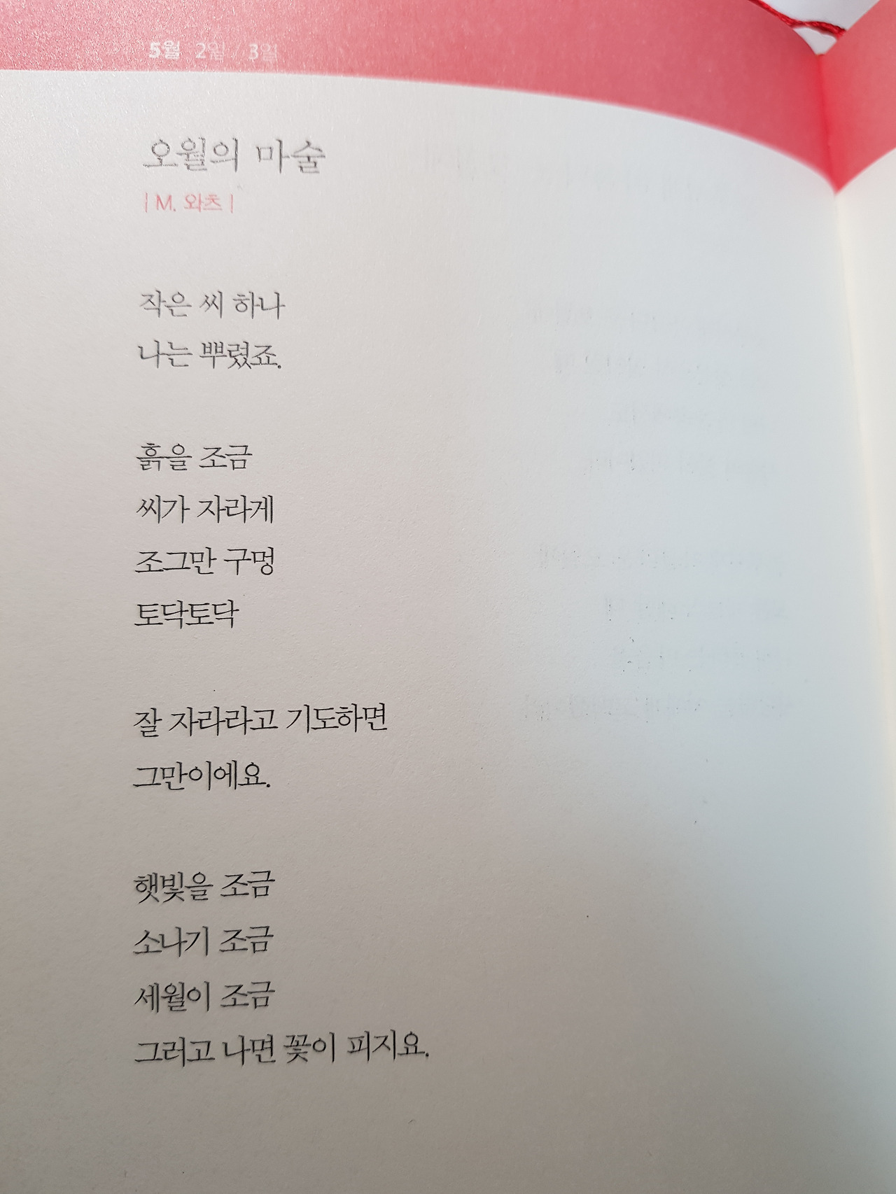 365개의 시를 다 읽어 보라고 추천하지는 않는다. 추천할 시는 5월 2일에 있는 < 오월의 마술 >이라는 시다.