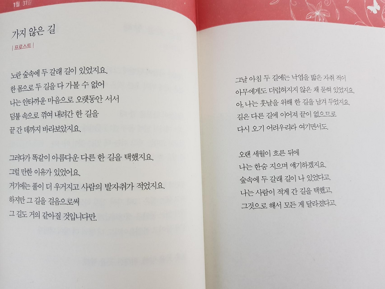 똑같이 아름다운 다른 한길을 택했지요. 그럴 만한 이유가 있었어요. 거기에는 풀이 더 우거지고 사람의 발자취가 적었지요... 중략