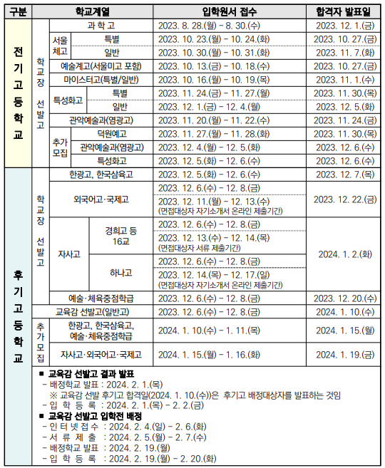 같은 후기고라 하더라도 특목고와 전사고, 자사고의 합격자는 일반고 보다 먼저 발표되는 점을 참고하시면 좋겠습니다. 다음 글에서는 일반고와 중점학급 입학 전형에 대한 말씀도 드려보도록 하겠습니다. 글 하나에 다 담을 수 있을 거라 생각했는데... 쉽지 않네요.