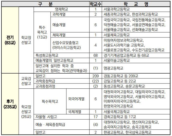 학교 유형별 전/후기 구분 (출처: 서울시교육청)