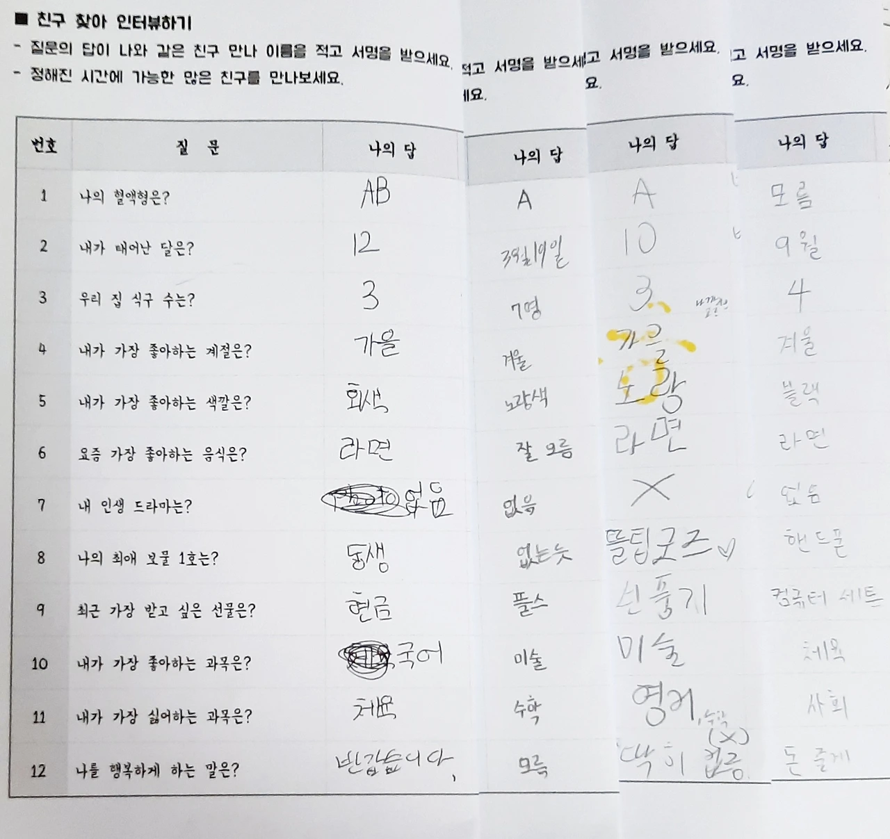 학생들이 서로를 알아가는 데는 재미있는 게임만 한 게 없죠. 저는 거기에 조금 더 특별한 의미를 담았습니다. 나에 관해 생각해 보는 질문 12개를 담은, 일명 '人터뷰'. 같은 질문에 나와 답이 같은 친구를 찾아서 사인을 받는 아이스 브레이킹은 다소 소란스럽긴 해도 짧은 시간 동안 여러 친구들을 만나고 말을 섞는 데는 그만이죠.