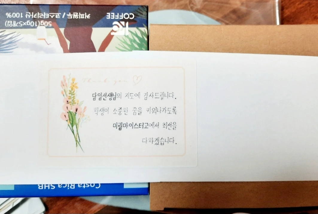 더듬어보니 작은아이가 그토록 바라고 원하던 고등학교에 다닐 수 있게 되어 참으로 다행이란 생각, 도와주신 선생님들께 감사한 마음이 듭니다. 이미 한 차례 예비소집도 다녀왔고, 교복도 맞추었죠. 내년 1월에는 2박 3일의 OT도 예정되어 있습니다. 예비 고등학교에서 집으로 보내온 담임 선생님과 합격생을 위한 작은 선물 상자와 메시지에 지난 시간들이 스치며또 한 번 울컥했네요.