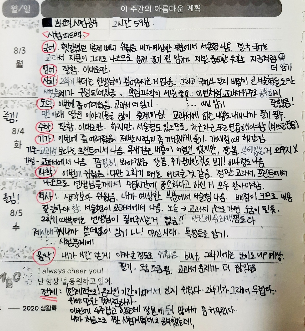 큰아이는 시험 후 자기평가, 일명 시험 피드백을 꼭 하도록 도왔습니다. 플래너를 본격적으로 쓰기 시작한 중1 때부터 지금까지 한결같이 말이죠. 그런데 작은 아이는 이게 쉽지 않네요. 첫 중간고사로 국어, 영어, 수학, 과학, 이렇게 네 과목을 봤습니다. 시험공부를 제법 충실하게 한 수학과 영어는 시험이 끝나자마자 쏜살같이 답안을 맞춰보더니 자신이 없는 국어와 과학은 미루고 미뤄서 주말까지도 깜깜이 점수입니다. 결과와는 무관하게 시험을 마쳤다는 홀가분함으로 주말을 행복하게 보낸 작은 아이에게 중간고사 시험 피드백을 어떻게 하면 좋을지 고민이 많습니다.
