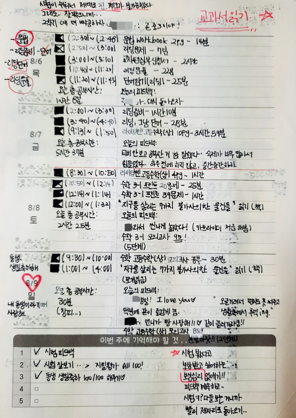 시험 기간 중에도 체크할 점이 있습니다. 문제는 다 풀었는지, 풀지 못했다면 시간이 부족해서였는지 문제를 푸는 요령이 부족해서였는지, OMR 카드에 정확히 옮겼는지, 시험을 방해하는 기타 요소들이 있었는지 등을 피드백 항목에 넣을 수 있겠죠. 간혹 시험 감독 선생님의 구두 소리, 앞자리에 앉은 친구의 다리 떨기, 시계의 초침 소리, 향수 냄새 등이 시험의 방해요소로 작용하기도 하니 참고하시면 좋을 것 같습니다.