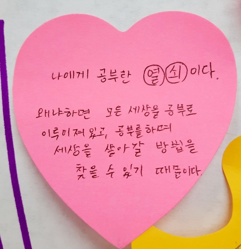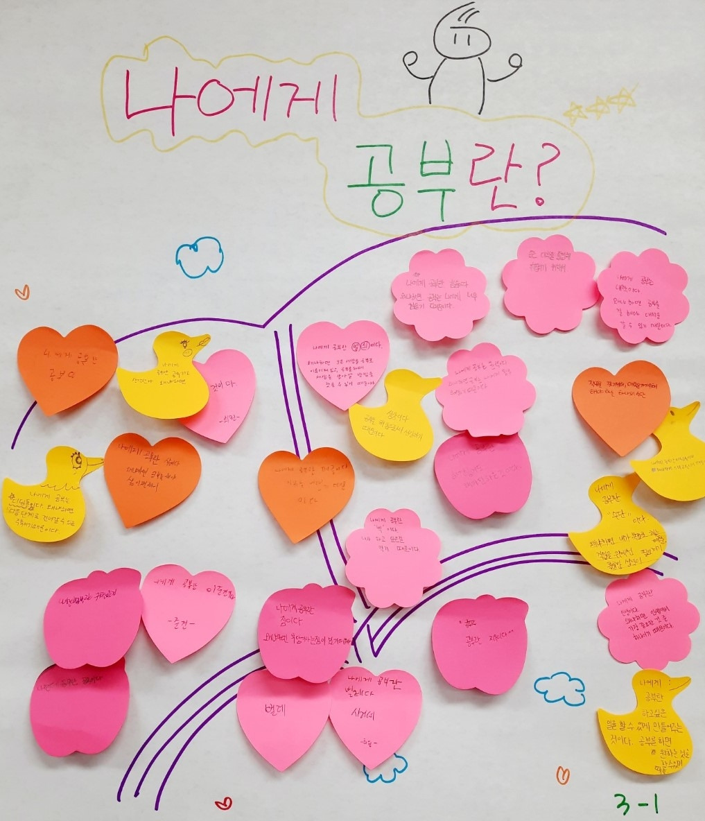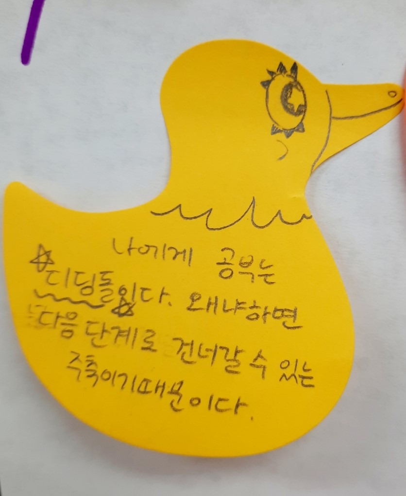 학생들이 제 이름을 유추할 수 있도록 간단한 '아재개그'로 시작하고(이름을 밝히는 순간 '와~~'하는 탄성이... 좀 즐깁니다 ㅋㅋ), 난이도를 훅 낮춰서 쉬운 알파벳 게임으로 긴장을 풀고 다양한 답이 나올 수 있도록 유도합니다. 틀린 답을 얘기해도 하하하~ 웃을 수 있게, 부끄럽지 않게 만드는 게 목적이지요. 덕분에 무표정 얼굴에서 기대감이 묻어나옵니다. 이어서 각자 공부를 왜 하는지, 나에게 공부란 무엇인지 나누고, 자신의 진로와 학습의 고민들을 털어놓게 합니다. 학생들이 잘 따라오냐고요? 그럼요. 우리에겐 도장판이 있잖아요.