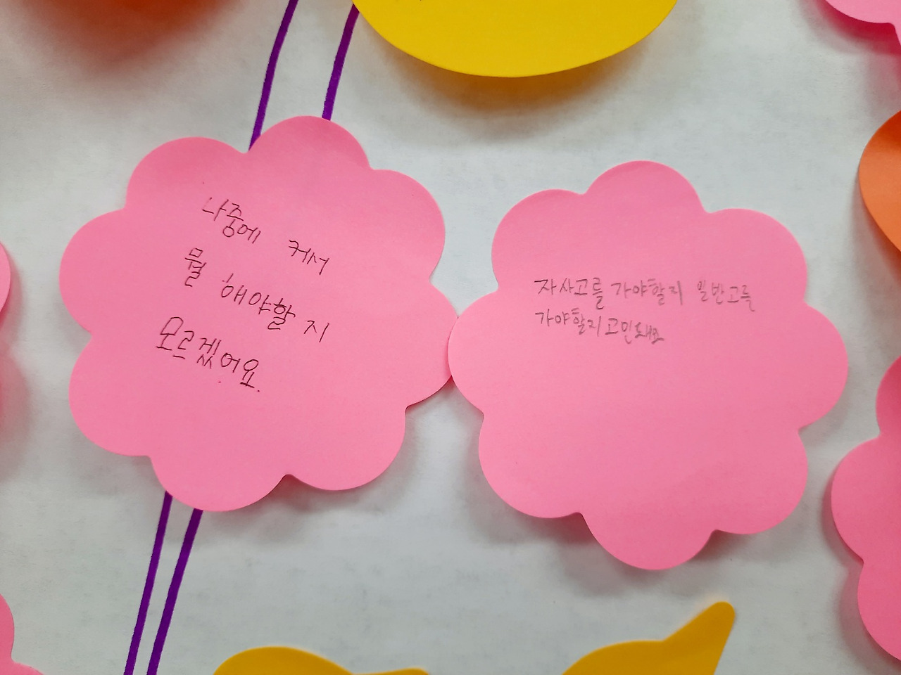 생각보다 계열 살펴보기에서 시간이 제법 많이 소요됐습니다. 학생들도 자신들이 이 정도로 몰랐나 싶었답니다. 일방적으로 주는 정보에만 익숙해져 있던 친구들은 자기들끼리 머리를 맞대고, 의견을 나누었던 이 시간을 통해 메타인지가 생긴 것입니다. 막연하게 알고 있던 계열과 학과에 대한 정보를 이렇게 친구들과 이야기를 주고받으며 얻었으니 쉽게 잊지는 못할 겁니다.