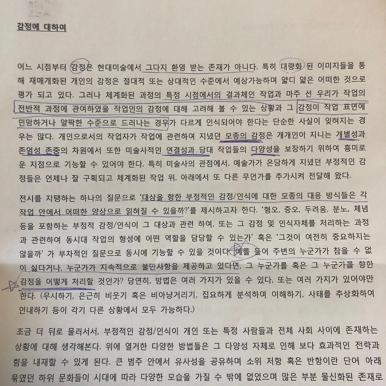 미술관, 박물관, 그리고 갤러리에는 전시를 소개하는, 혹은 작품의 설명이 들어있는 글들이 있다. 예전엔 사심 없이 알고 싶어서 모으기 시작했고, 본격적으로 작품을 만들고, 전시를 하기 시작하고 나선 (이렇게 말하는 게 어떨진 모르겠지만) 의무적으로 집으로 가지고 온다. 조금 더 시간을 들여 펜으로 밑줄을 치며 그리고 작가의 다른 작품들까지 찾아보며 작품세계를 깊게 이해하려고 하는 이유도 있지만, 나는 어떻게 써야 할까, 어떻게 읽힐까에 중점을 두고 좋은 점을 ‘훔치기’ 위하여 다시 한번 읽어본다.
