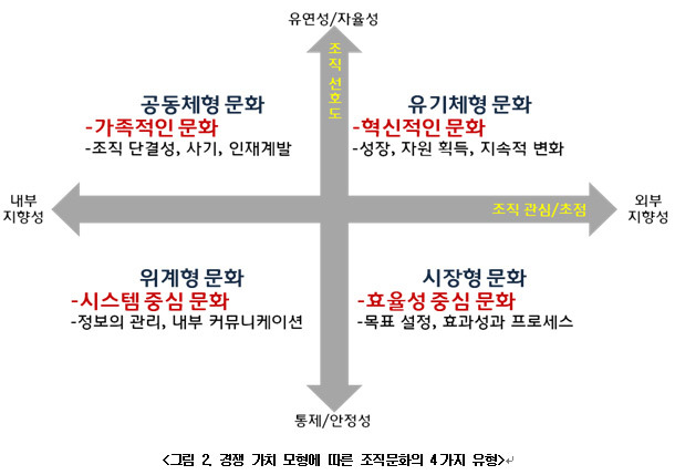 나는 NGO (비영리 기관)에 다니는 8년차 직장인이다. 한국에서 어려운 나라를 도와주는 국제개발 사업을 담당하는 업무를 3년 반하고 국제사업 전략을 담당하는 업무를 3년 반하고 다시 사업담당자로 돌아왔다. 그 8년의 시간동안 한 기관을 다니고 있다. 10년 근속자가 허다한 그런 기관이니 나같은 직원은 오래다닌 축에도 못낀다. 회사 복지가 좋은 것도 있고, 영리기관보다는 사내외 경쟁이 덜 치열하기에 좀 안정적인 분위기도 있다. 그렇기에 조직문화가 권위적이면서 보수적인 부분이 많다. 그에 더해서 일하는 방식도 오래된 옛 방식을 고수하고 변화를 두려워하는 면도 없지는 않다. 우리 조직의 민낯이지만 우리만 그런게 아니라 이 분야의 문화가 대부분 그렇다. 아래 표를 보면 가족적인 문화와 시스템중심의 문화 중간 어디 쯤인 것 같다.