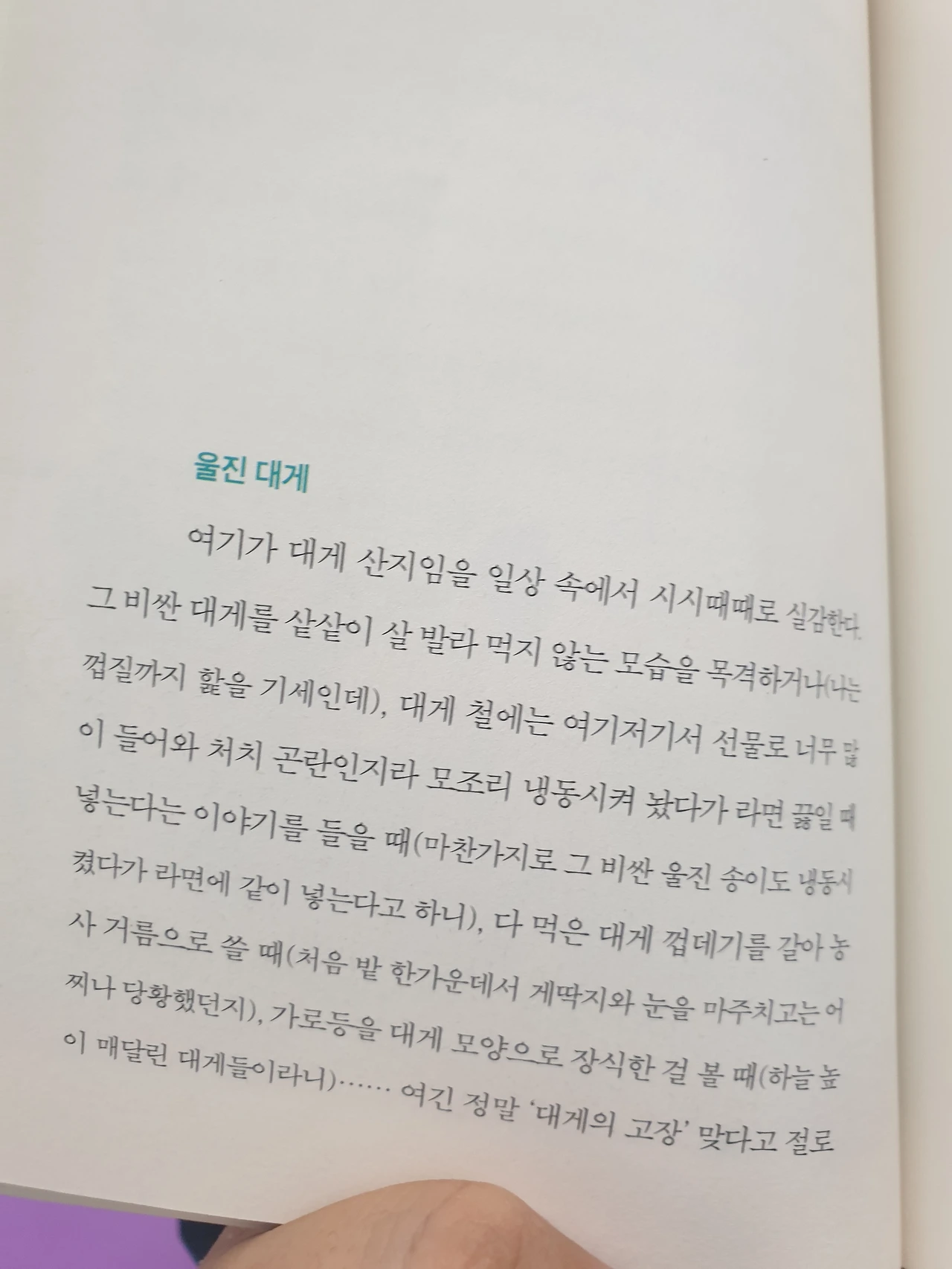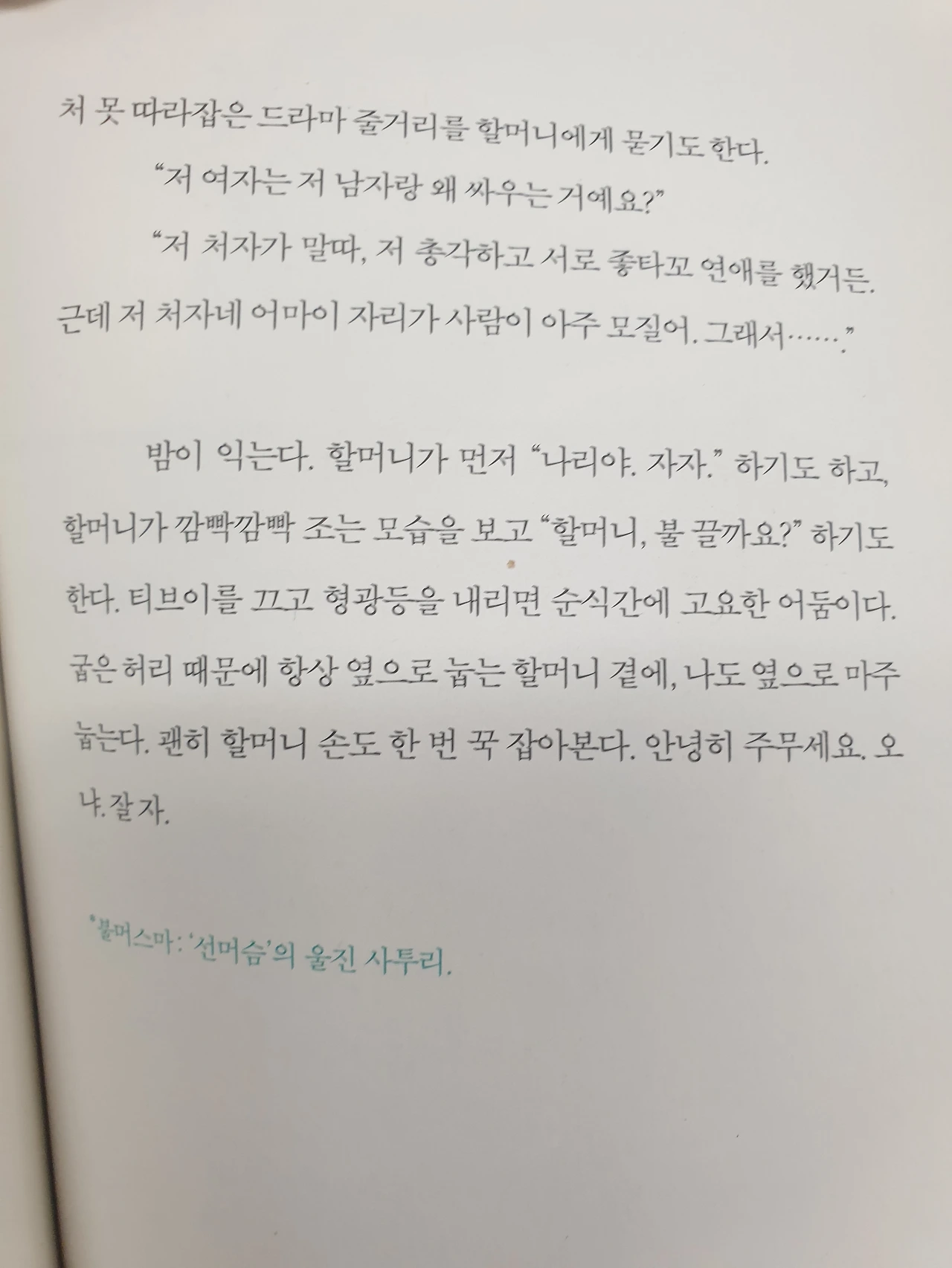 할머니 사진이 표지에 있는 이 책은 분명 맘이 따뜻한 책일 듯했다. 에세이란게 그런 건가. 별 특별한 얘기는 아닌데 맘이 따뜻해지고 내 이야기 같아 더 깊이 빠져드는. 율진에 할머니가 사는 작가는 울진을 탐색하며 여행하는데 본부는 울진읍에 할머니 집이다. 나도 할머니랑 같이 살았던 적이 있다. 그래서 할머니 옆에 누워서 할머니 팔베개하고, 할머니랑 마주보며 손잡기도 하고 그랬던 기억이 오랜만에 떠올랐다. 굽은 허리, 엘레베이터 탈줄 몰라서 7층 아파트에 갇혀지내던 할머니. 우리 할머니가 계속 생각이 난다.
