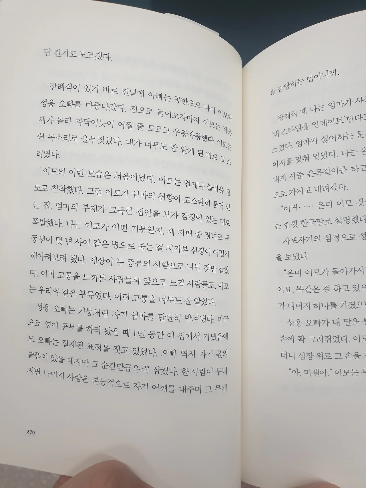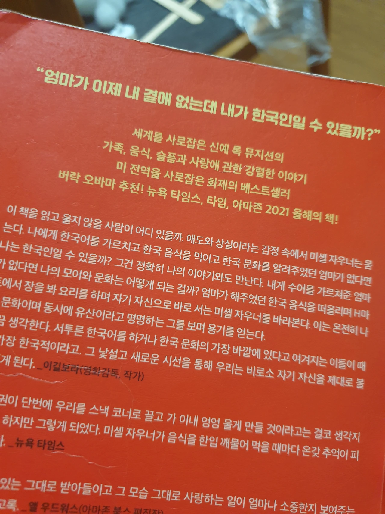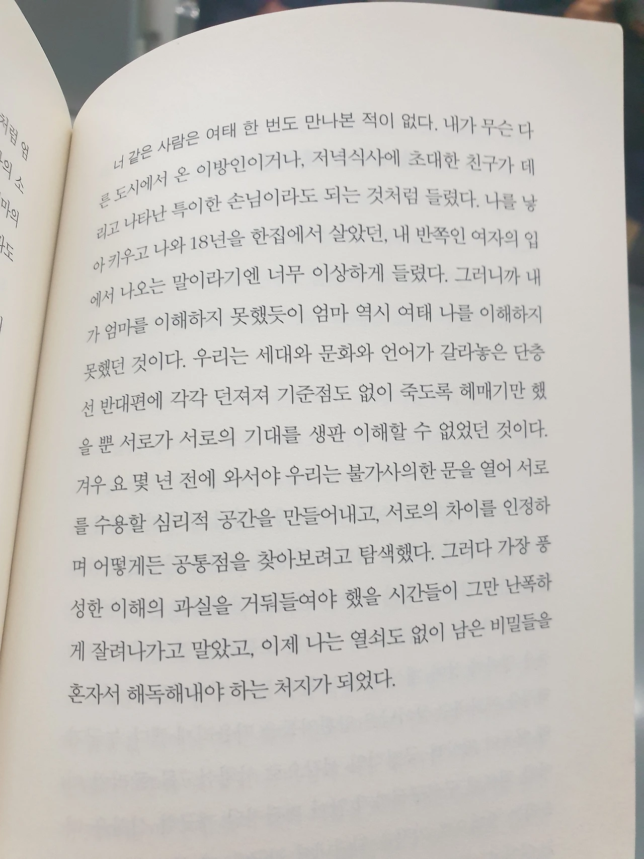 백인 아빠와 한인 엄마 사이에서 태어난 여자의 성장 과정과 엄마의 암투병과 죽음을 주축으로 일어난 일들을 기록한 책이다. 소설같은 이야기가 빠져들게 만든다. 다문화 가정의 자녀로써 정체성의 혼란을 겪으며 많은 방황과 부모와의 갈등으로 격화되고, 결국 엄마의 죽음으로 인한 부재로 인해 깊은 모녀간의 관계를 깨닫게 된다.
