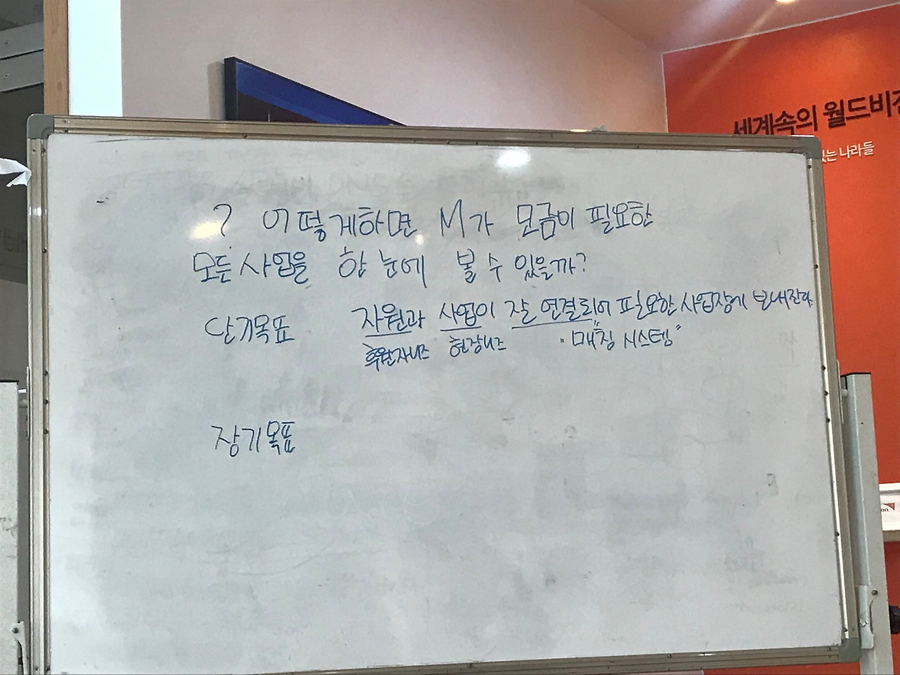 현황을 이해하는 과정을 통해서 우리가 해결해야하는 당면 스프린트 문제를 정의하였다. 그리고 단기 목표를 거꾸로 설정해 올라갔다. 현재 우리가 해결해야하는 문제는 너무 당연했고, 이 문제를 해결했을 때의 파급효과에 대한 정의를 단기목표로 정했다. 기존의 방식을 역으로 해서 목표설정하는 방식이다. (전형적 방식: 함께 달릴 목표점을 정하고 현재 문제를 파악하라)