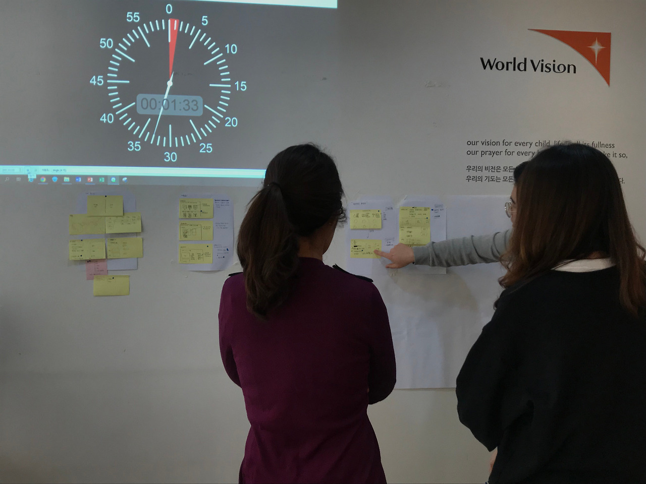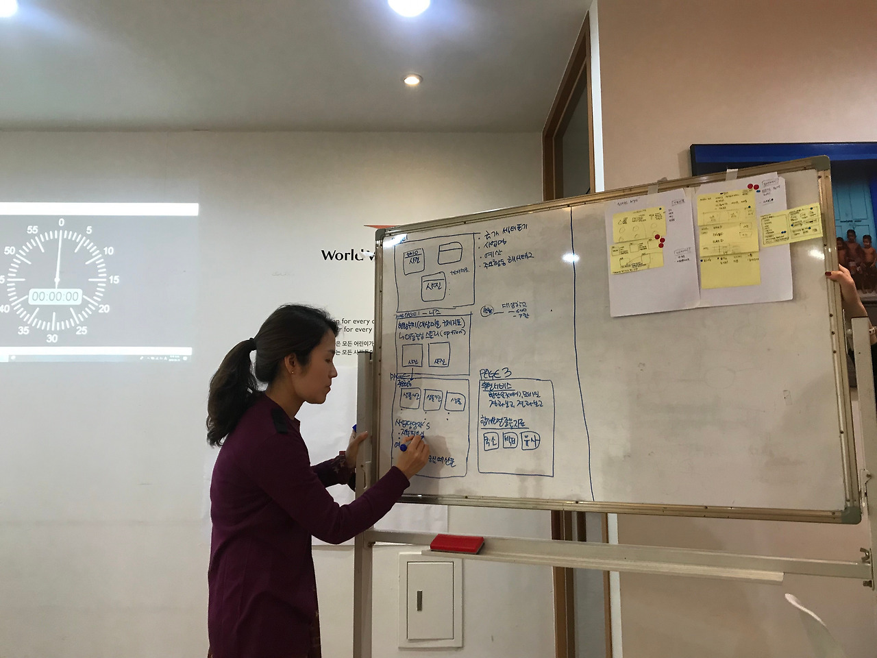 최종 스케치를 기반으로 스토리 보드를 작성하는데까지 반나절(오후 1시~5시)이 걸렸다. 그리고 스토리 보드를 바탕으로 프로토타입을 완성하는데 3일이 걸렸다. 예상했던 것보다 프로토타입 제작에 시간이 걸렸는데, 프로토타입르 구현할 provider를 찾아내고 모금 가능한 제안서를 취합하여 재가공하다보니 시간이 생각보다 오래 걸렸다. 디자이너인 케일리의 도움이 없었다면 불가능했을 프로토타입 (정말 이 프로젝트를 위해 하나님이 보내주신 천사)을 만들면서 "이건 프로토타입이야, 욕심을 버리고 우리가 정의한 문제 안에서 가장 최소한의 기능만 탑재하자"라고 하며 욕심을 버리는 노력을 했다.