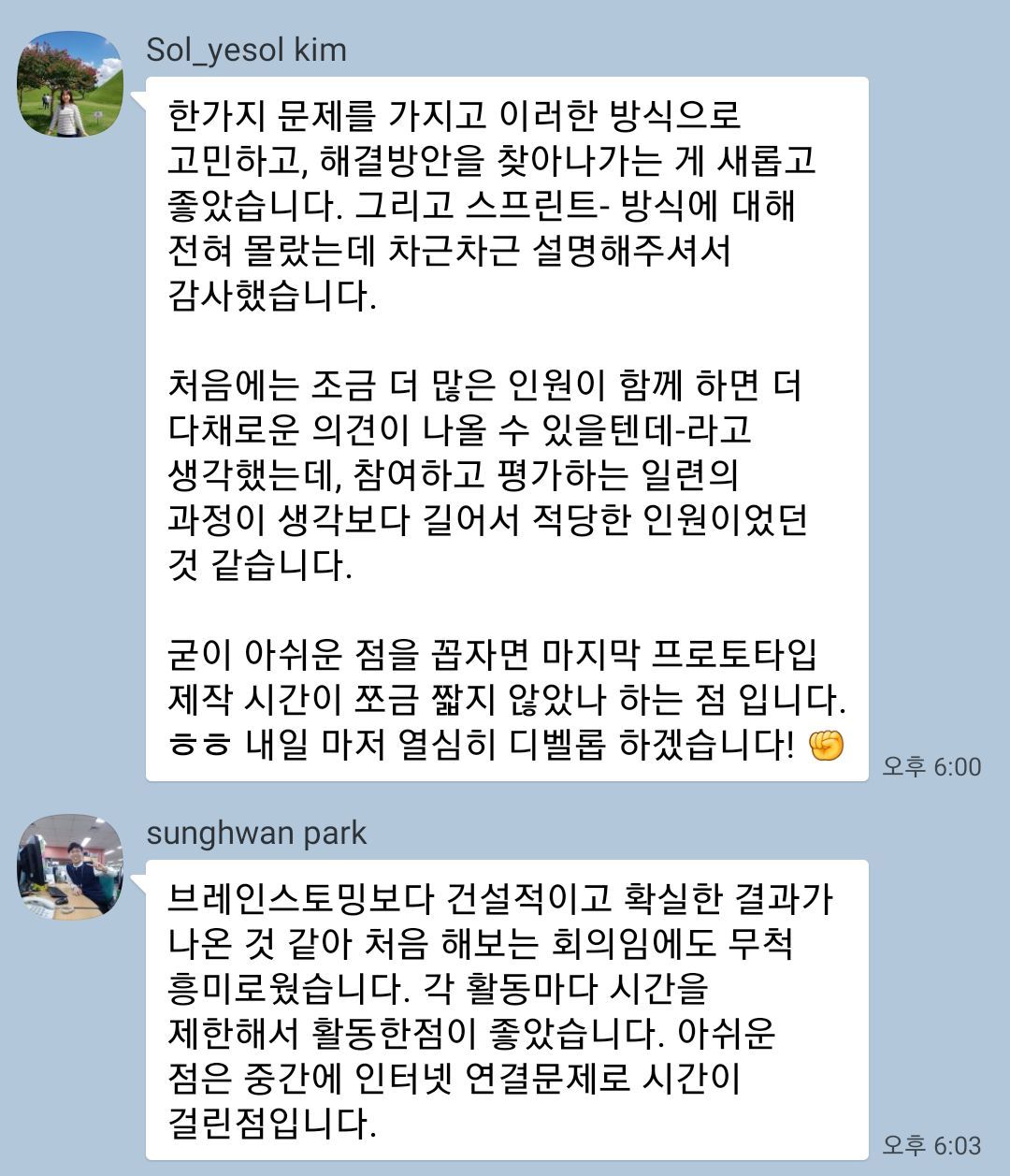 시간이 부족하여 스토리보드 제작은 생략하고 진행하였음에도, 프로토타입을 워크샵 당일에 완성하지는 못했다. 차주 수요일 오전에 직원 대상 피티를 진행하고 검증받는 시간을 갖기로 하였다.