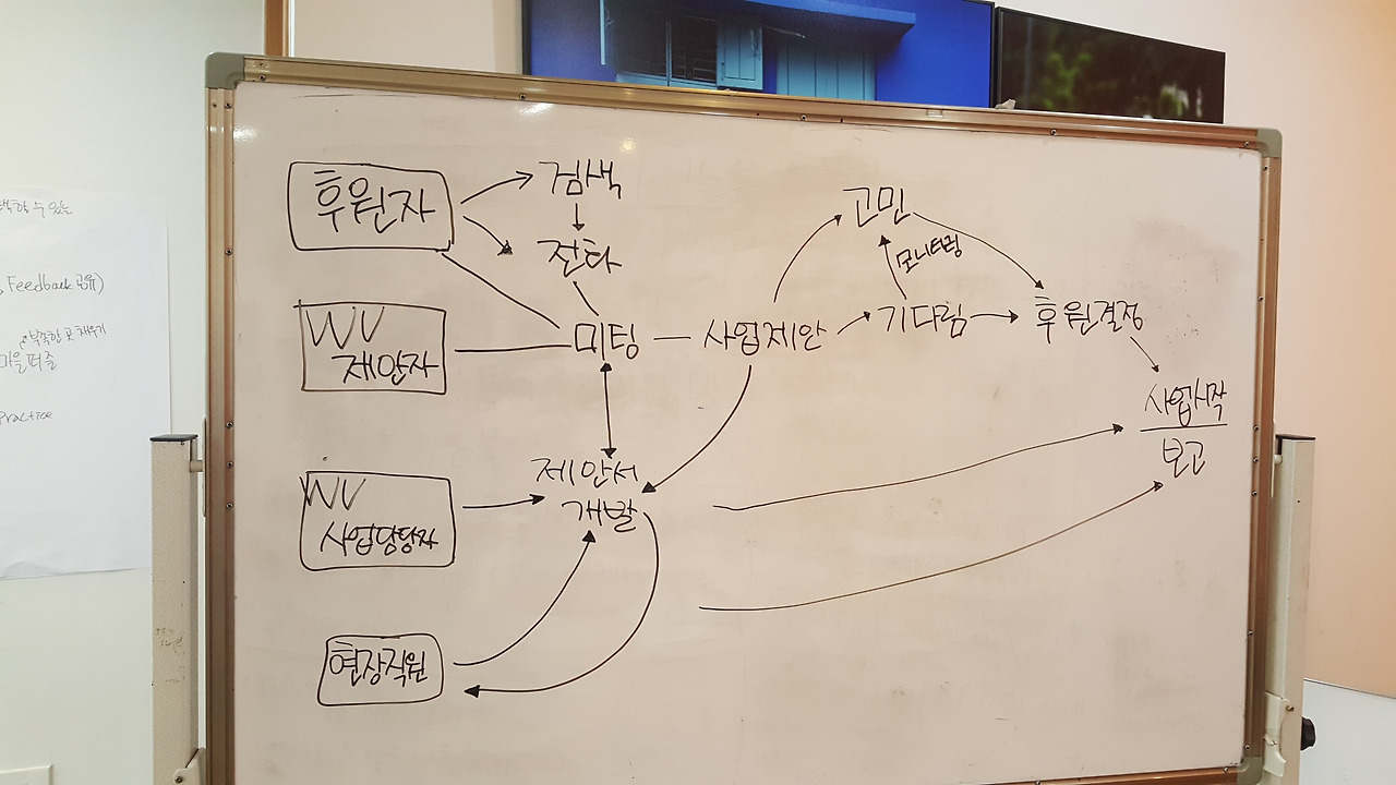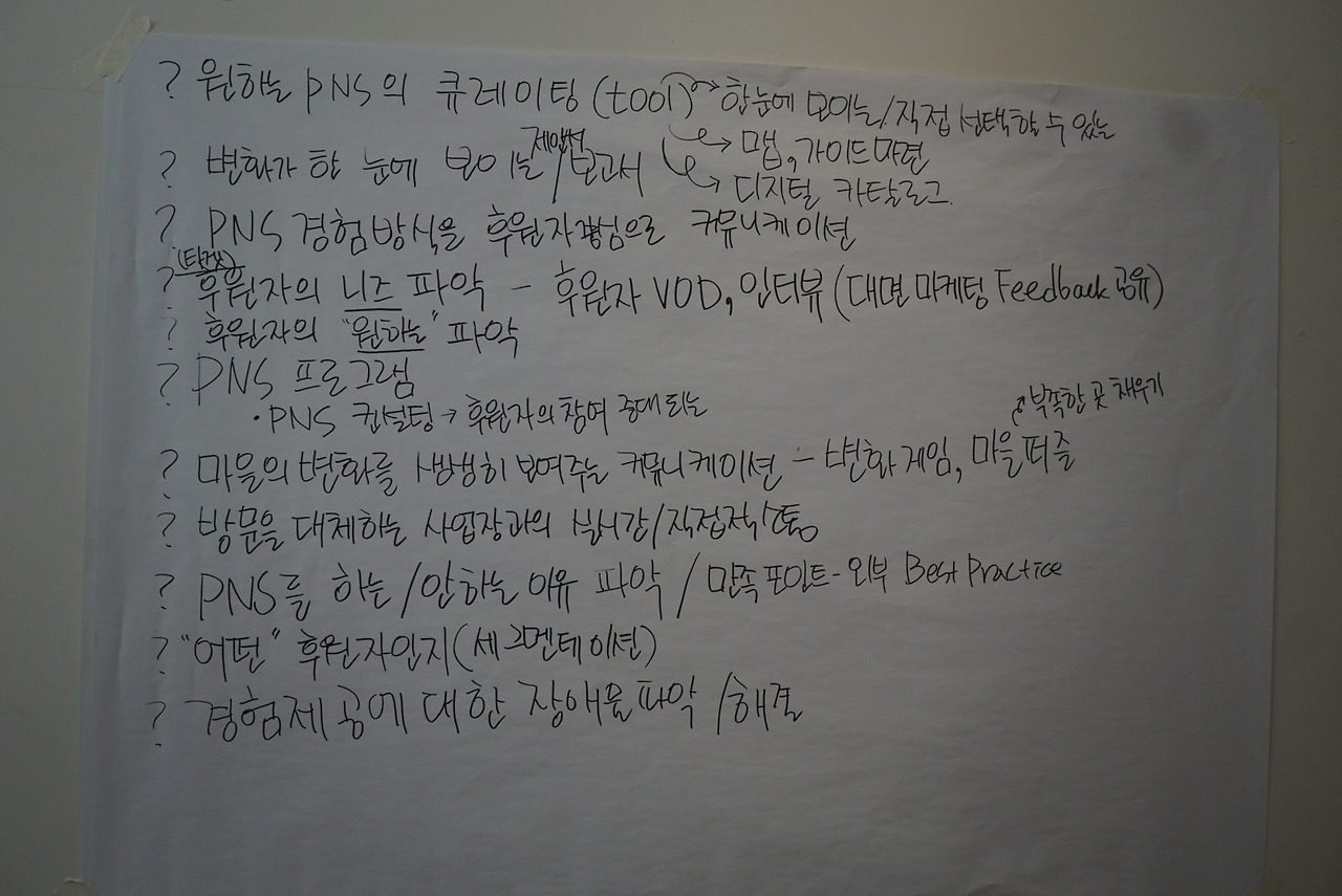 이 과정을 통해서 사업담당자는 모금활동가의 고충을, 그리고 모금활동가는 사업담당자의 어려움을 서로 이해할 수 있었다. 막연히 알고 있던 그런 어려움을 직접 피부로 와닿게 이해한다는 것이 대단히 중요하다라는 것을 이번 과정을 통해서 알게 되었다. 아래 도표처럼 우리가 만든 PNS 지도는 매우 단순하다. 그러나 이 지도를 만들어 가는 과정에 참여한 스프린트 팀원들은 이 과정 전체를 이해하는 더 큰 시각을 갖게 되었다. 판을 이해하는 그 시각이 단순하게 '네 일 내 일'의 문제가 아닌, PNS의 문제를 해결하는 근본적인 시작점으로 스프린트프로젝트를 셋팅하게 만들었다.