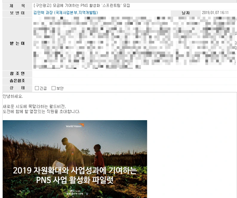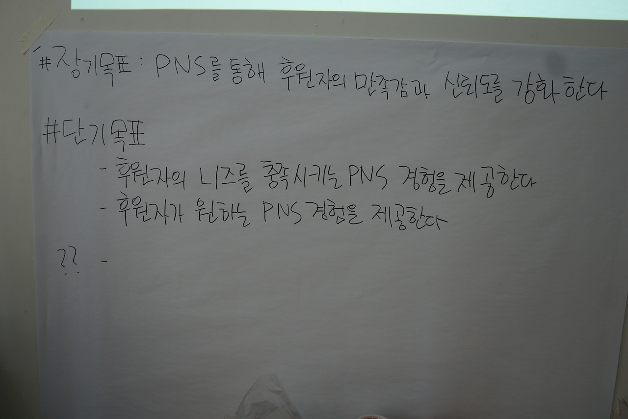 PNS 사업과 관련된 현재의 문제를 분석하고 그 분석 결과를 해결하기 위한 프로젝트라는 것을 메일에 담아 지역본부를 포함한 전사에 스팸메일처럼 여러 번에 걸쳐 구인광고를 냈다. 이런 일에 적극적인 팀장님, 과장님, 대리님이 신청을 해주셨다. 연초에 마케팅 지역본부는 모금활동으로 가장 바쁜시기이다. 지역본부의 부족한 인력에도 불구하고 프로젝트에 참여할 수 있었던 모금활동가들 뒤에는 지역본부장님과 팀장님의 지원과 응원이 있다. 물론 지원하였지만, 팀장님의 승락을 받지 못해 참여하지 못한 직원도 있다.