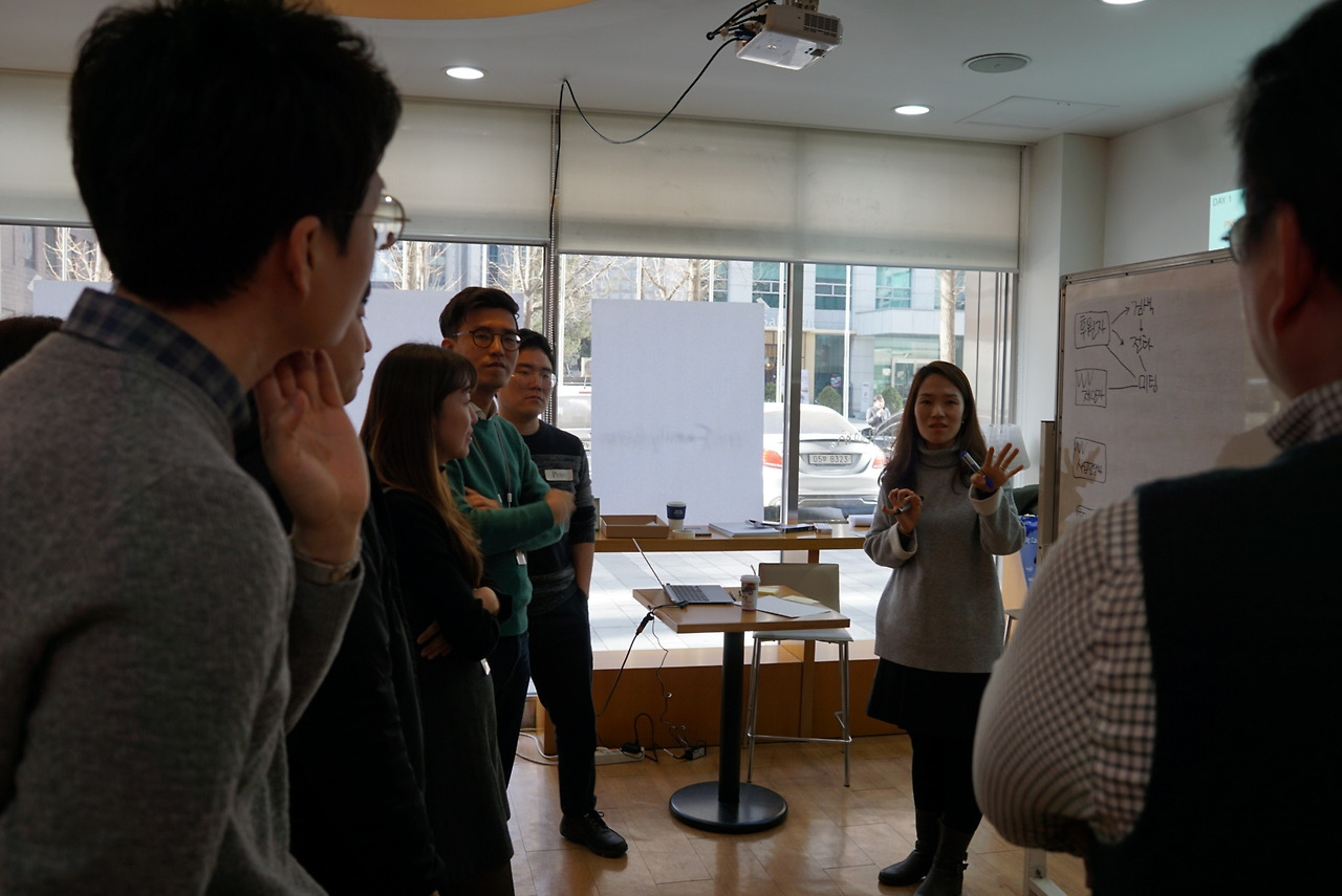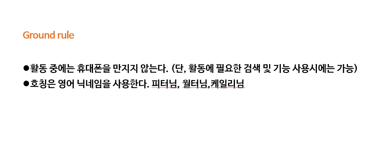 간단히 스프린트 과정에 대한 소개를 하고 Ground rule도 정했다. 직책과 역할이 다르기에 직급과 본명으로 호칭하지 않고 영어 닉네임으로 부름으로써 나이, 직급, 경험을 벗어나 자유롭게 누구나 소통할 수 있는 환경을 만들고 싶었다. 프로젝트에 참여는 하지만 바쁜 현업을 내려놓기가 쉽지 않다. 쉴새없이 전화오고 문자와 카톡으로 연락이 오면 능동적인 참여와 창의적 사고에 방해가 될 것이기에 핸드폰은 뒤로 멀리 놓고 쉬는 시간에만 잠시 이용하기로 하였다.