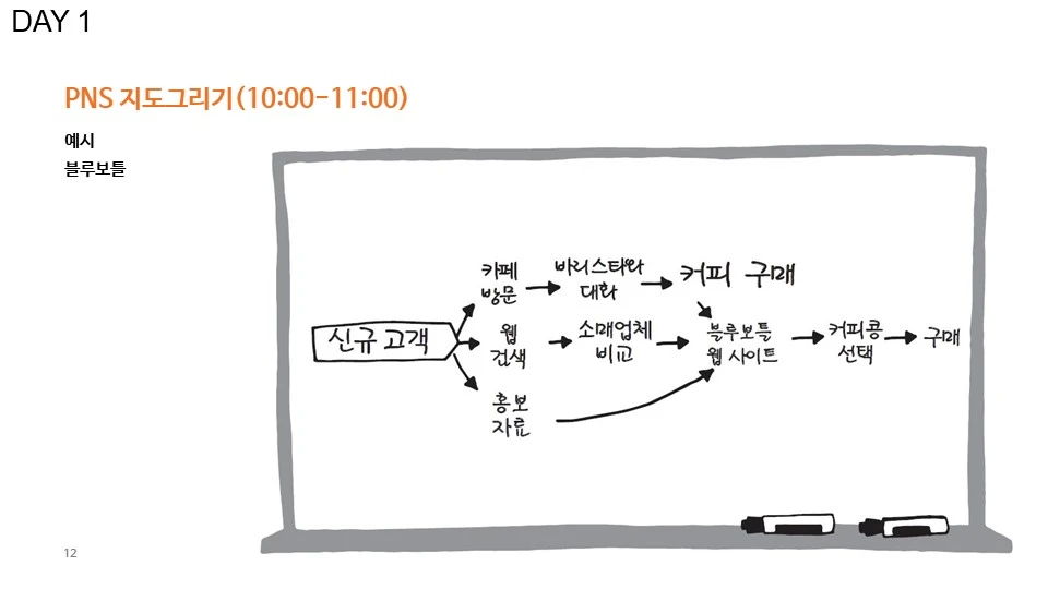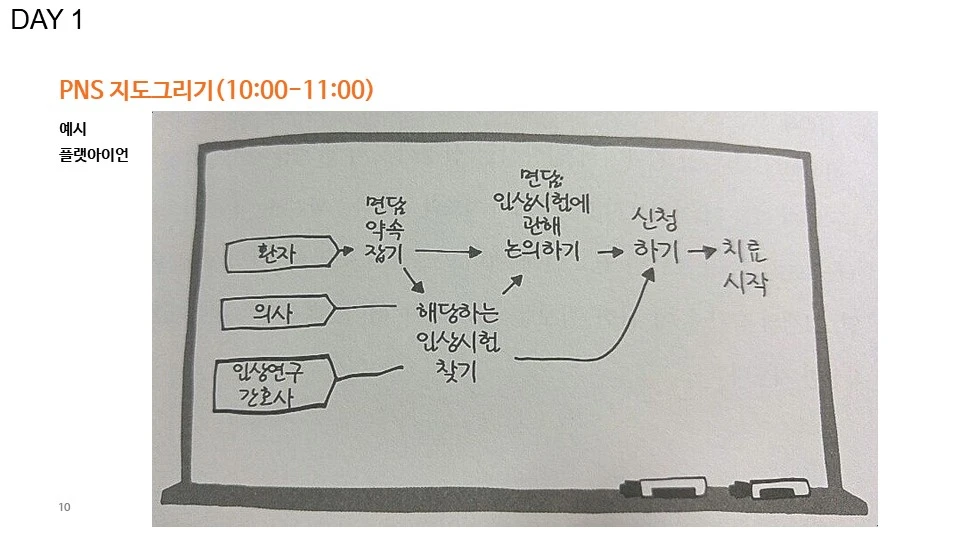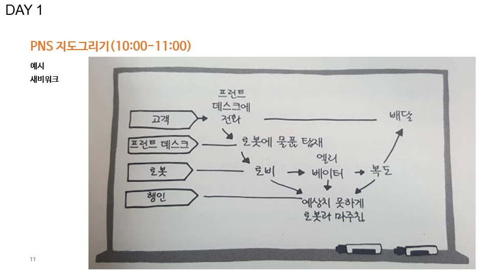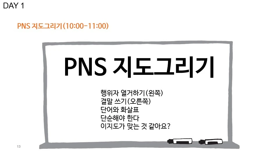 우리가 그린 PNS 지도는 우리만의 지도이다. 이 것을 더 객관화하고 혹시라도 지도내에 우리가 발견하지 못한 다른 화살표 길이 있는지 검증하는 시간이 필요하다. 우리끼리 이해하는 것을 넘어 직접 이 서비스를 담당했던 전문가들을 모시고 이 과정에 대한 이야기를 더 들어봐야 한다. 이 '지도 검증 과정'이 전문가 의견 구하기 단계다. 그 과정은 오후에 점심 먹고 시작하게 되었다.