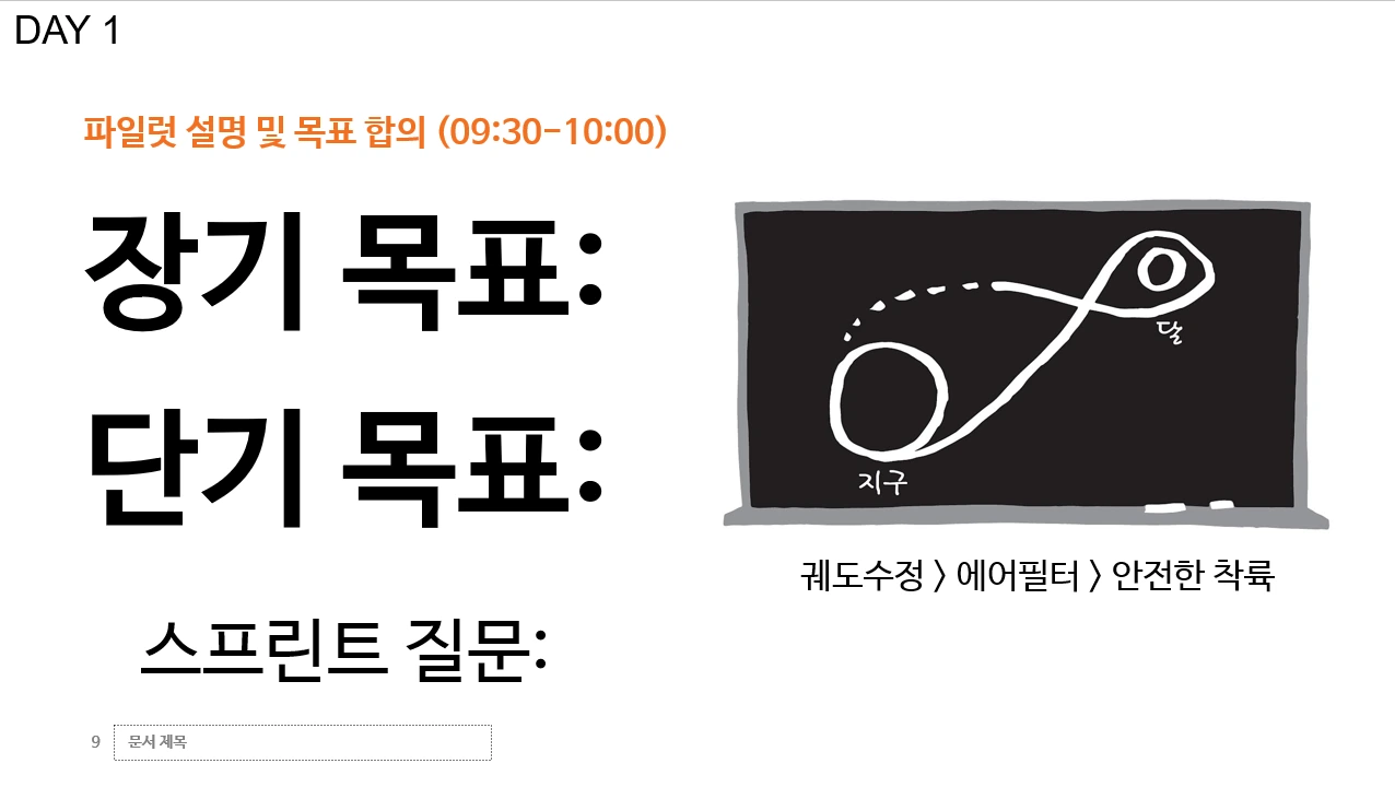 장기, 단기 목표가 있다하더라도 우리는 모든 것을 할 수는 없다. 짧은 5일의 스프린트 기간안에 단기 목표에 기여할 수 있는 다양한 문제들 중에 우리는 하나만을 선택하여 그에 대한 솔루션을 도출하고 그것을 프로토타입으로 만들어야 한다. 그 작은 퍼즐 조각이 스프린트 질문이 되는 것이다. 우주선의 무사 귀환을 위한 다양한 문제들 중에 현재 가장 핵심적이라고 생각하는 안전한 착륙이 그것이다.