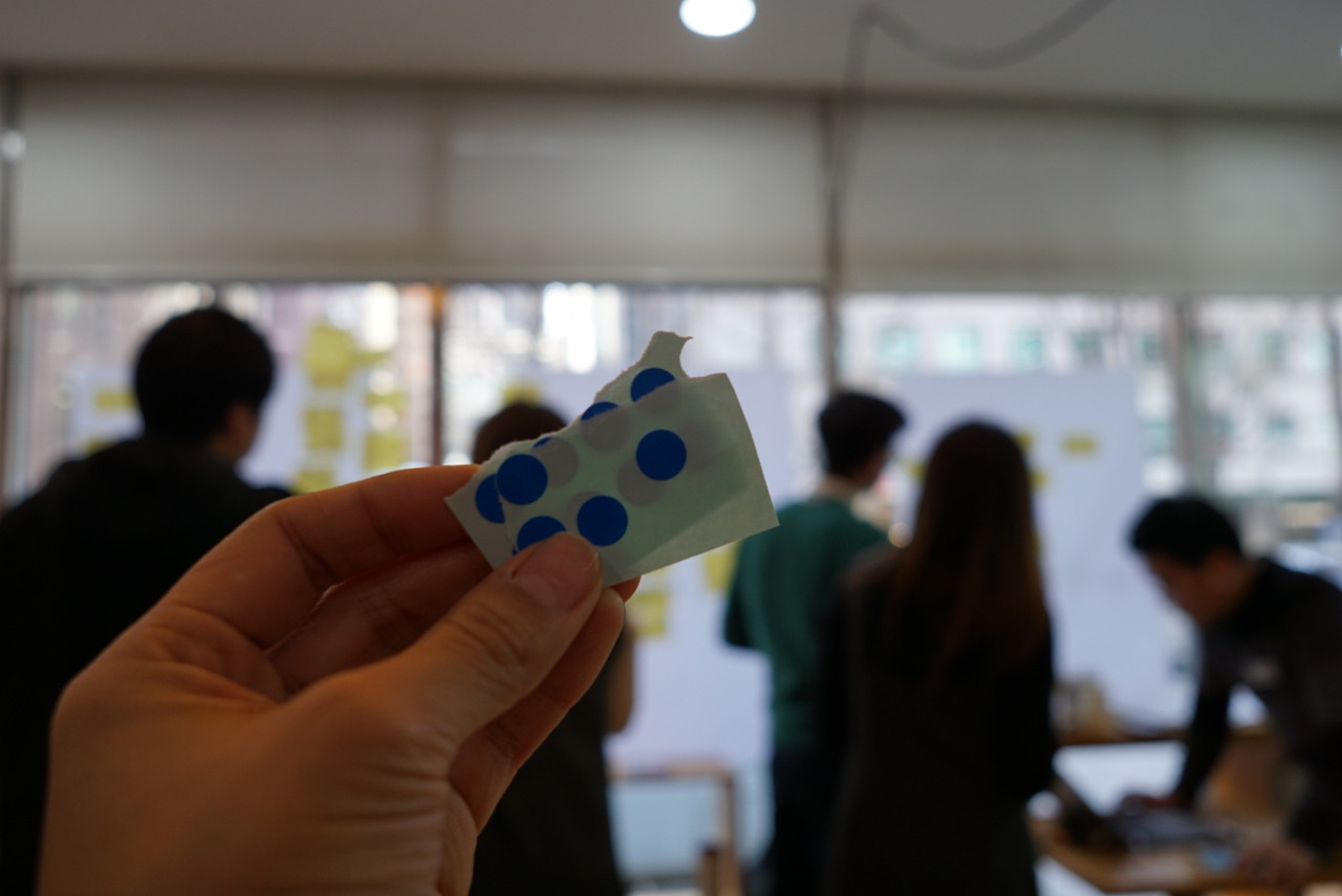 분류된 질문들을 한번 더 읽으면서 더 좋은 의견이 생각나거나 하면 추가 메모를 한다. 혹은 읽다가 또 다른 좋은 좋은 질문이 생각나면 추가로 적어서 붙인다. 그리고 9명 각자에게 작은 점 스티커를 주고 스프린트 질문으로 유망하다고 생각하는 질문에 스티커를 붙이도록 한다. 스티커 개수는 제한없이 사용할 수 있다.