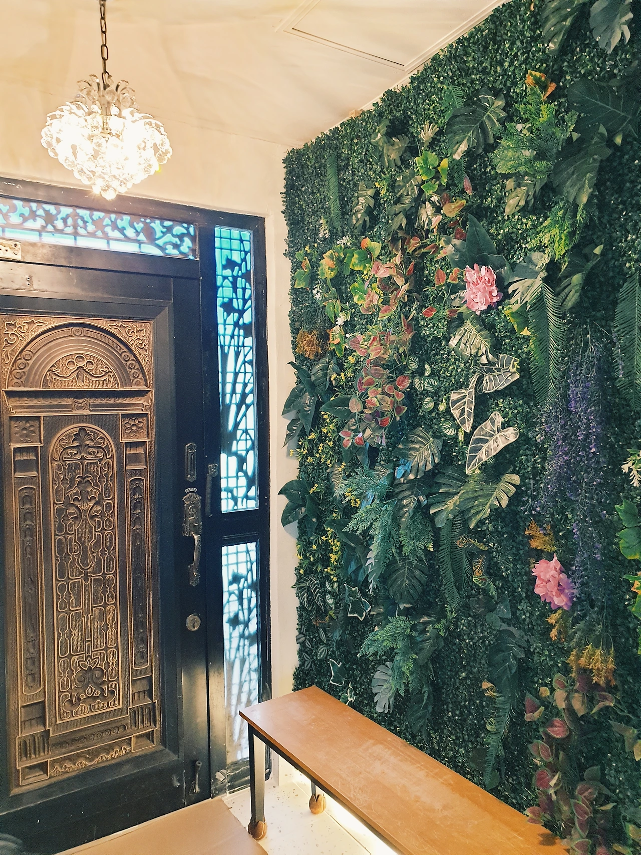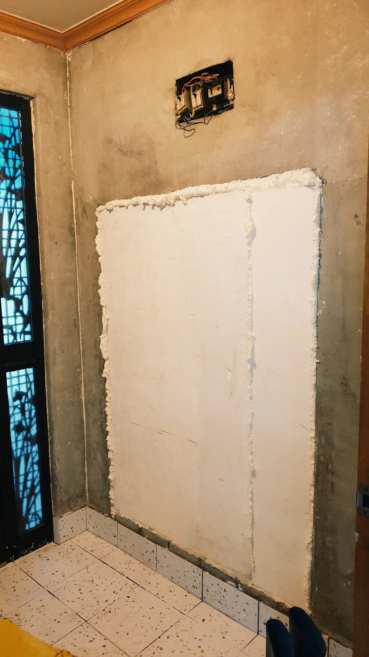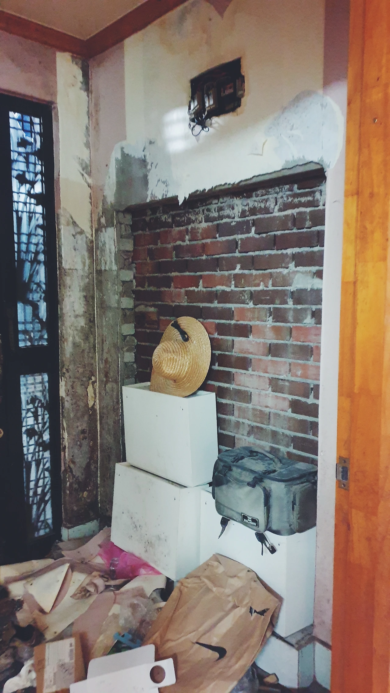 신발장이 있던 자리를 뜯어보니 벽돌로 만들어진 외벽이 드러났다. 느낌이 너무 좋아서 살려보고 싶었다. 그래서 1년 이상 건드리지 않고 계속 고민했는데, 두번째 겨울이 찾아오니 한기가 너무 쎄서 이대로 두면 집이 너무 춥겠다 싶어서 뒹굴던 스티로폼으로 두겹 덧대어 붙이고 깔금하게 마감하려 했으나 너무 밋밋해서 타일도 생각하고 고재 나무로 덧댈까도 생각하다가 좀 더 특별하게 가자 생각하고 플랜테리어를 흉내냈다. 썩맘에 들진 않아도 그런대로 특색은 있다