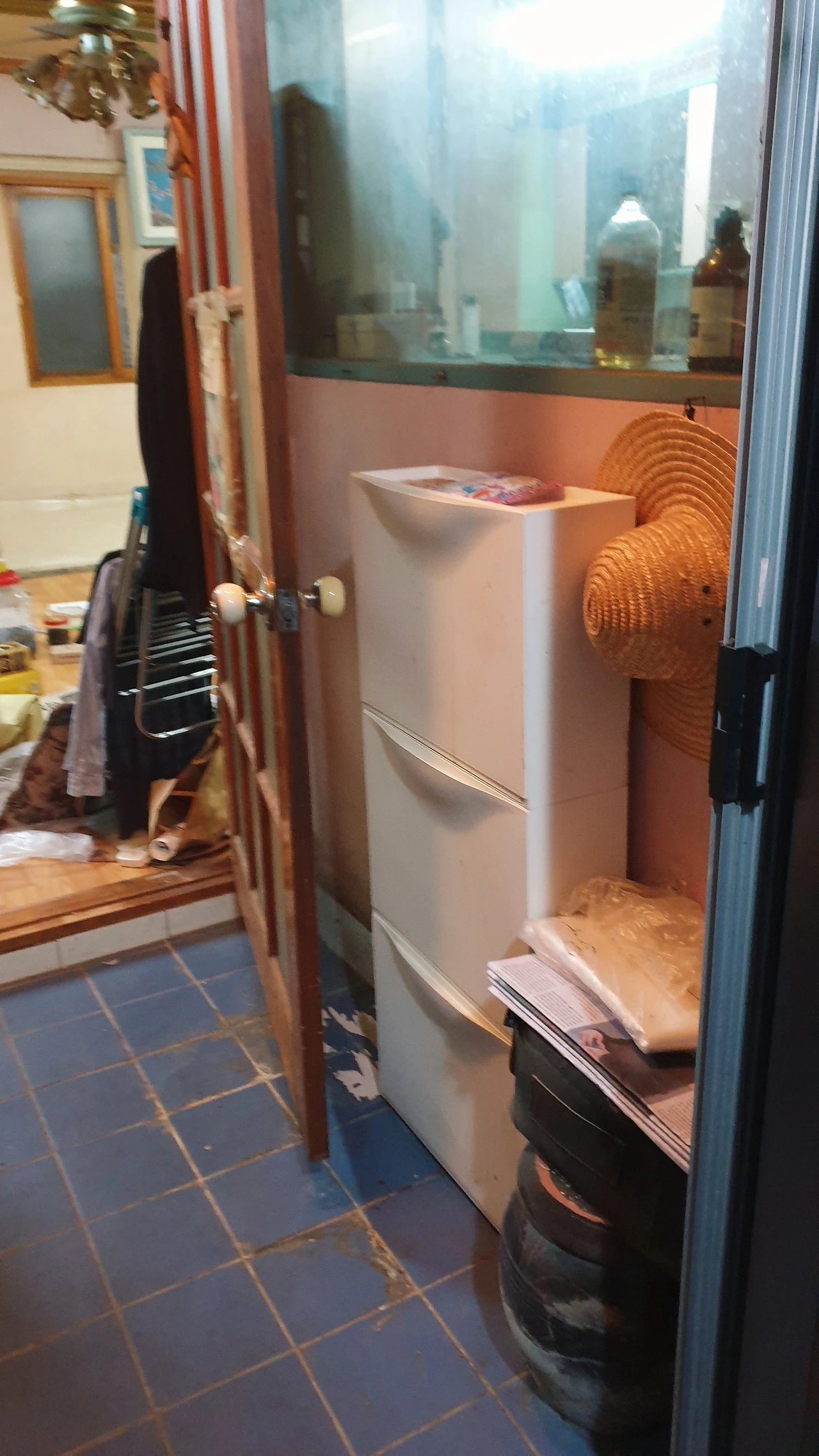 시골에 있는 이 낡은 단독주택에 들어가서 처음 마주한 것이 넓은 중문 공간이다. 공간이 넓지만 특별할 것이 없다. 신발장과 가벽과 유리로 만들어진 공간은 큰데 쓸모가 없어 보인다. 집안으로 더 들어가보니 가벽에는 선반을 설치하여 수납공간으로 활용하고 있었다.