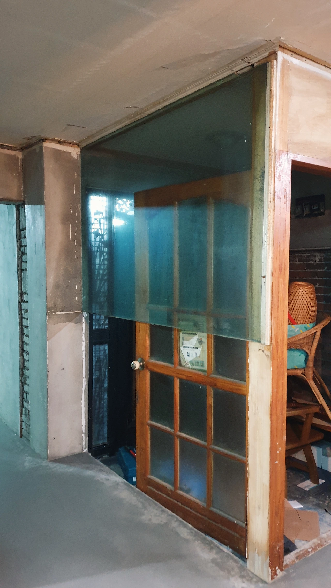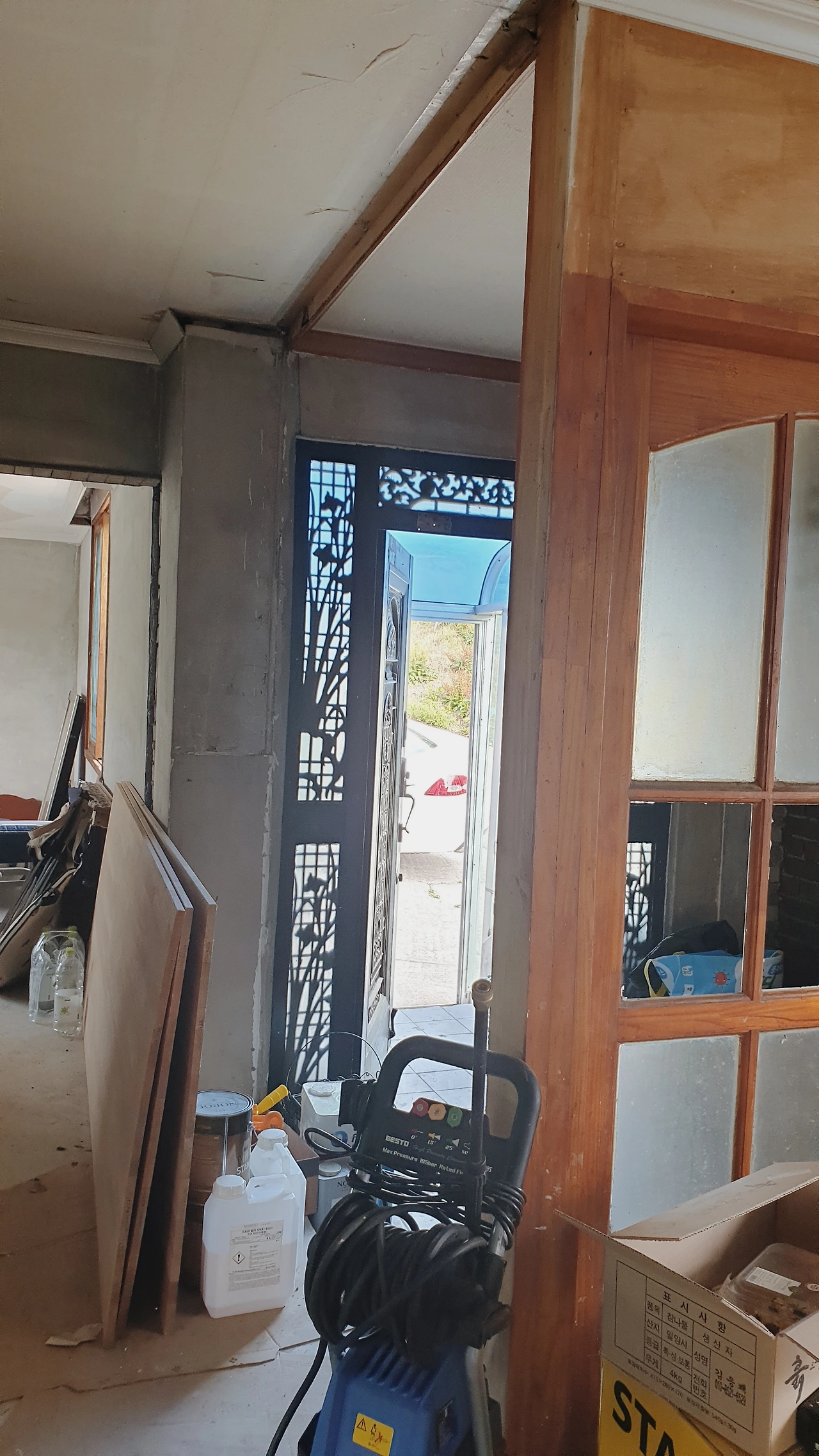 공간에 대한 컨셉이 없는 상태에서 별볼일 없는 선반은 일단 떼어냈다. 유리만 덩그러니 남은 상태에서 거실을 좀 더 크게 사용할 요량으로 중문 공간을 없앨까도 생각했는데, 시골의 단독주택은 추위 때문에 중문이 필요할 것으로 생각되어 생각을 고쳤다.