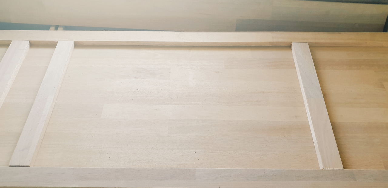 우선은 최대한 길이에 맞춰서 재단하고 상판 뒷편은 이렇게 보조목들을 대줘서 나무가 뒤틀리지 않도록 잡아준다. 본드를 바르고 피스를 박아주면 된다.