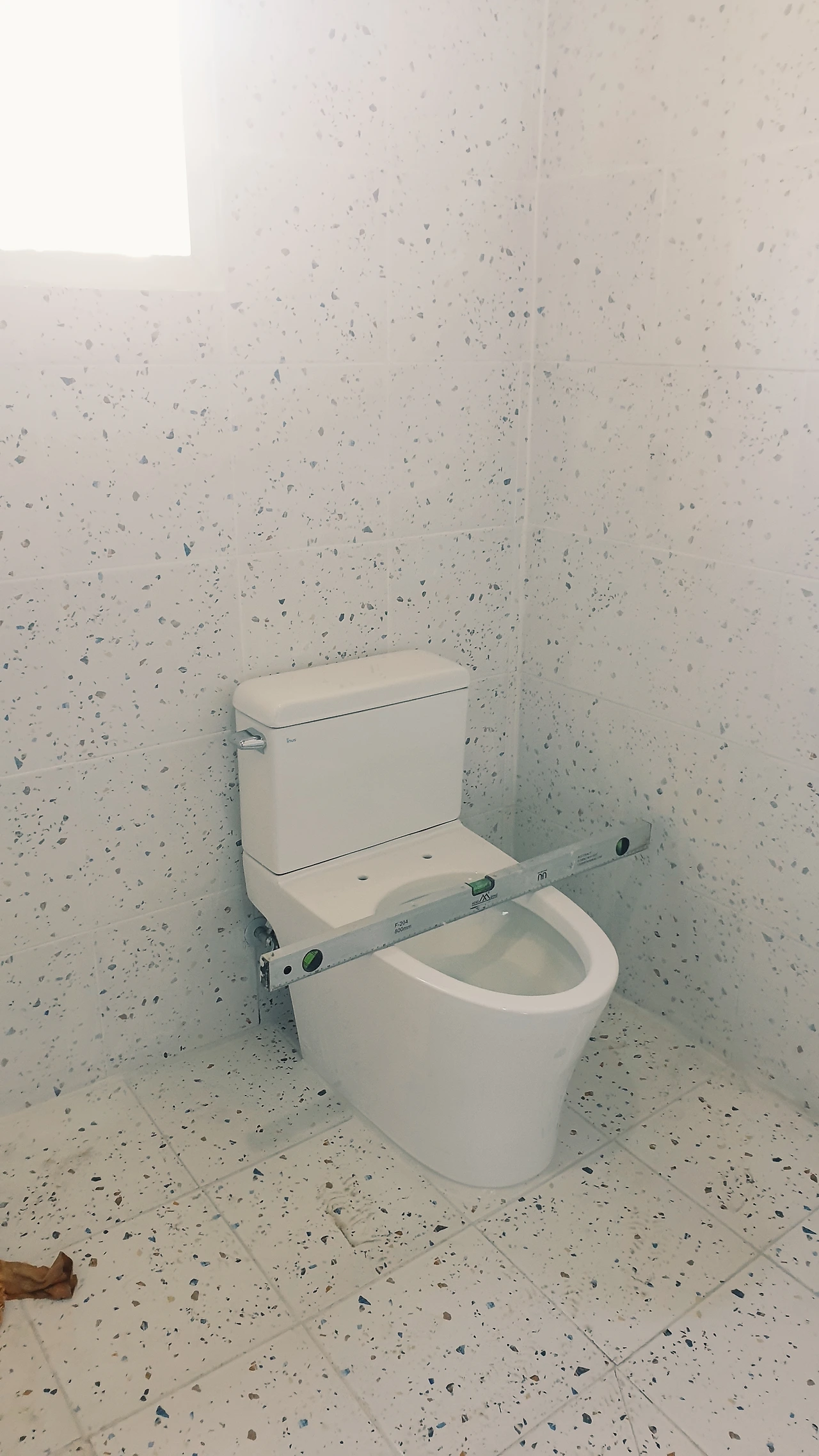 줄 눈을 넣은 뒤에 변기를 앉힌다. 변기의 모양도 다양하다. 가장 형태가 단순해 보이는, 아래부분이 곧게 뻗어 내린 변기 모양으로 선택하였다. 수평을 잘 맞춰서 설치를 해야 큰 일(?)을 바르게 잘 치룰 수 있다.