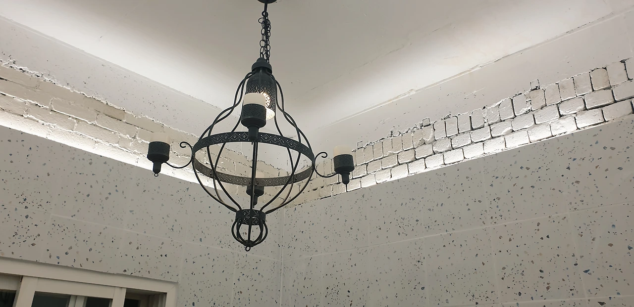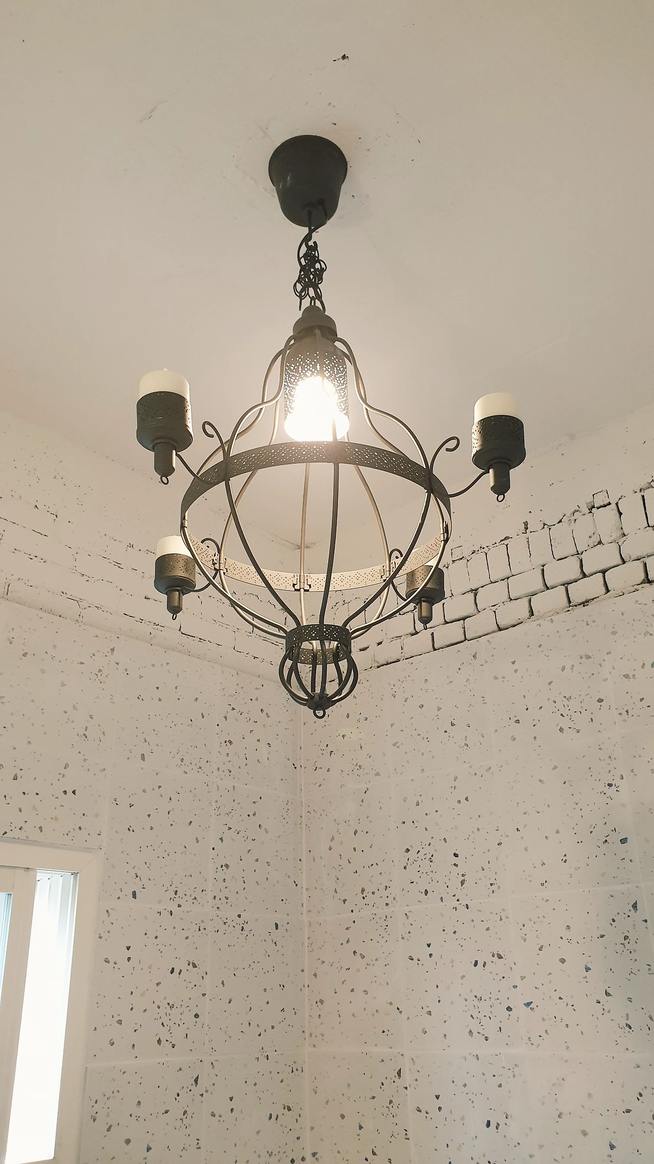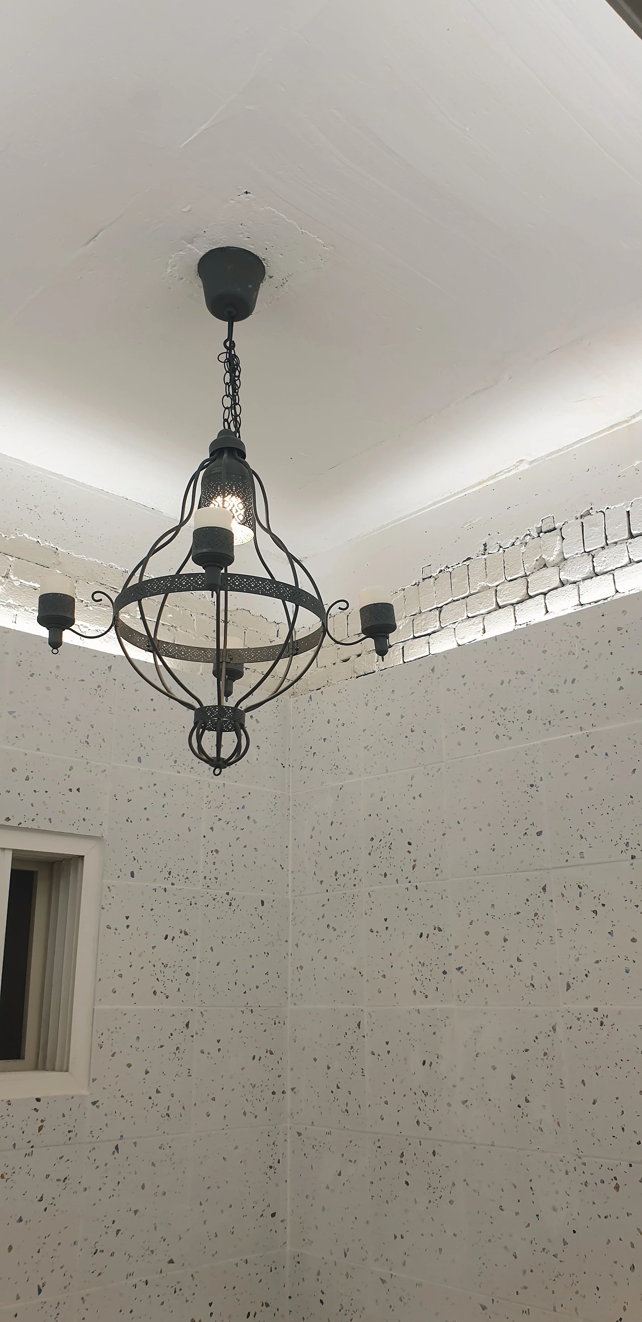 천장 쪽에 페인트 칠을 하고 조명을 달았다. 화장실에 사용하기에 조금 부담스럽지만, 높은 천고와 벽돌과 어울리는 조명이라고 생각했다. 거울에 비치는 자신과 전등과 화장실 분위기가 셀카를 찍고 싶어할만한 장면이길 바라면서..
