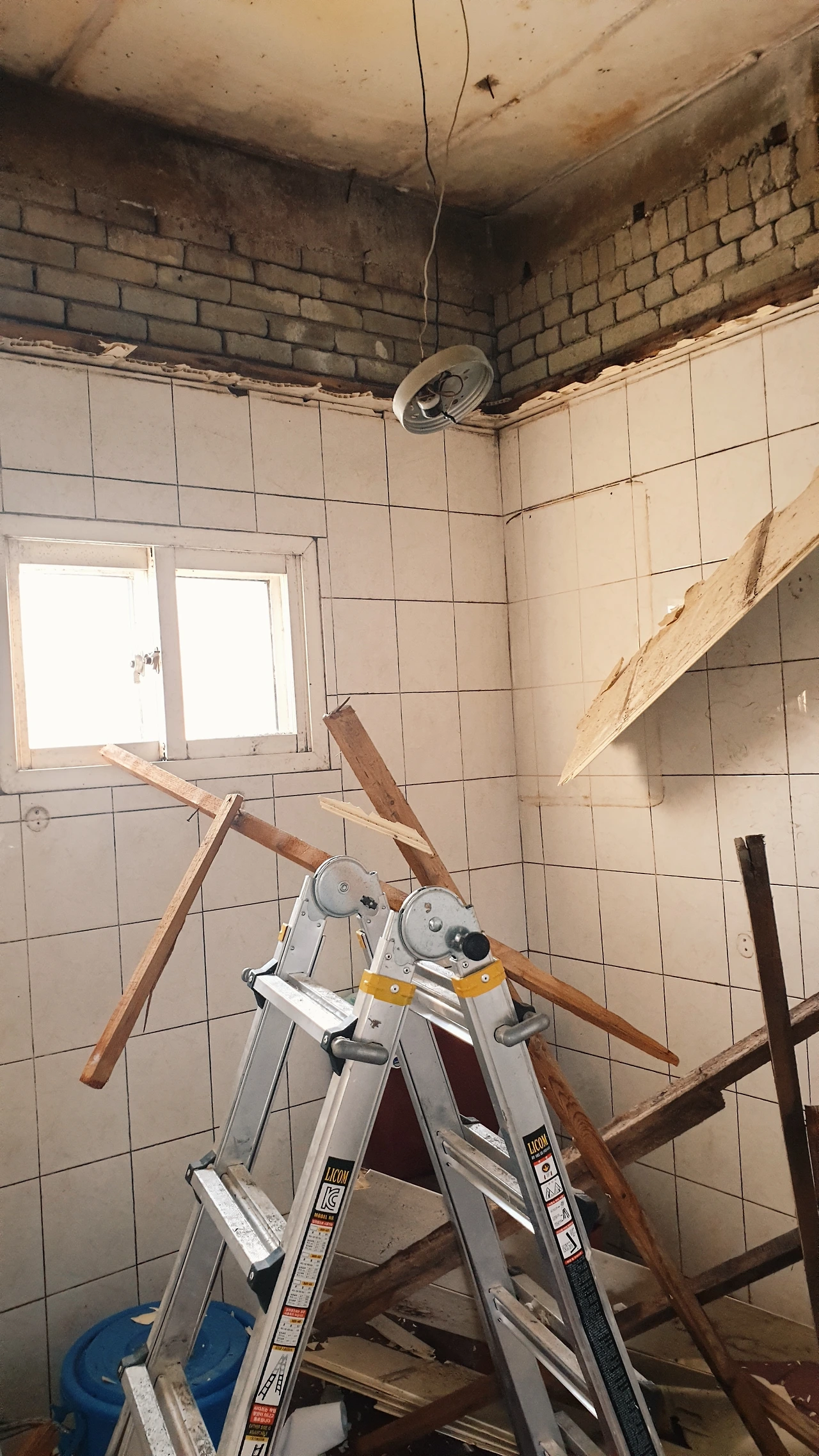 일단 때려부쉈다. 천장까지 철거를 하고보니 천고가 높은 화장실 공간이 멋져보였다. 가정집의 화장실은 천고가 낮다. 보통 우물천장을 넣어 마감을 많이 한다. 그 이유는 욕실 공간에 보온 때문이다. 따뜻한 공기가 넓은 공간을 채우기에는 시간도 오래 걸리고 에너지도 많이 소모되지만, 좁은 공간은 빨리 데울 수 있고 에너지 소모도 줄일 수 있기 때문이다. 그래서 우리집 화장실은 낮고 좁은 것이다.