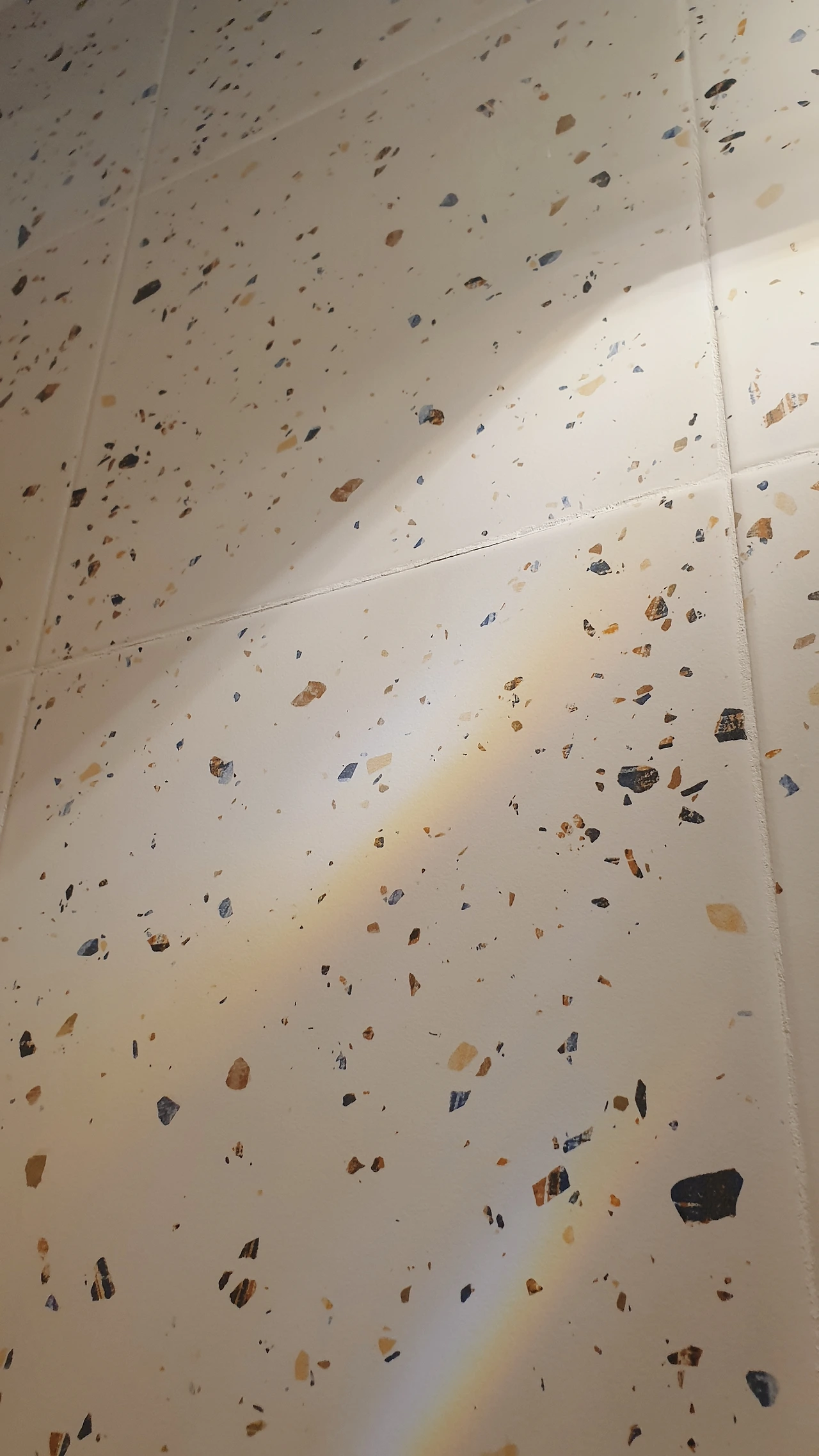 화장실의 벽면을 채울 타일 고르기가 화장실 공간의 분위기를 결정하는 가장 중요한 요소다. 방으로 치면 벽지를 고르는 것과 마찬가지이다. 타일을 고를 시기에 테라조 타일이 마니아들 사이에서 인기가 있었다. 옛날 학교 바닥은 회색 테라조 무늬가 많았다. 지금도 여전히 공공기관이나 옛 빌딩을 다니다보면 테라조 무늬의 마감이 많이 보인다. 요즘은 테라조에 들어가는 무늬가 큼지막하게 포인트를 주거나 색깔이 들어가서 자연스러운 타일이 많이 쓰인다. 이 집과 어울리는 타일이라 직접 타일집에 가서 받아왔다. 배송비를 아끼려고..