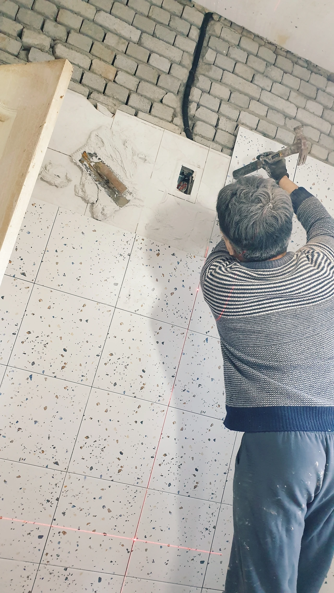 타일 붙이는 것도 쉽지 않다. 타일이 본드에 잘 붙어서 떨어지지 않도록 해야하는데, 콕콕 때려주면서 옆 타일과의 높이와 위아래 선들과 수평 수직이 잘 맞는지 계속 확인해야한다. 싸구려 레이저를 띄워놓았지만, 별 도움이 되지 않는다. 뒤로 물러나 수평 수직이 맞는지 오락가락 하면서 타일을 붙이니, 힘들기도 하고 시간도 많이 간다. 다시 생각이 든다. 그냥 업자 부르는게 나을 것 같은데..
