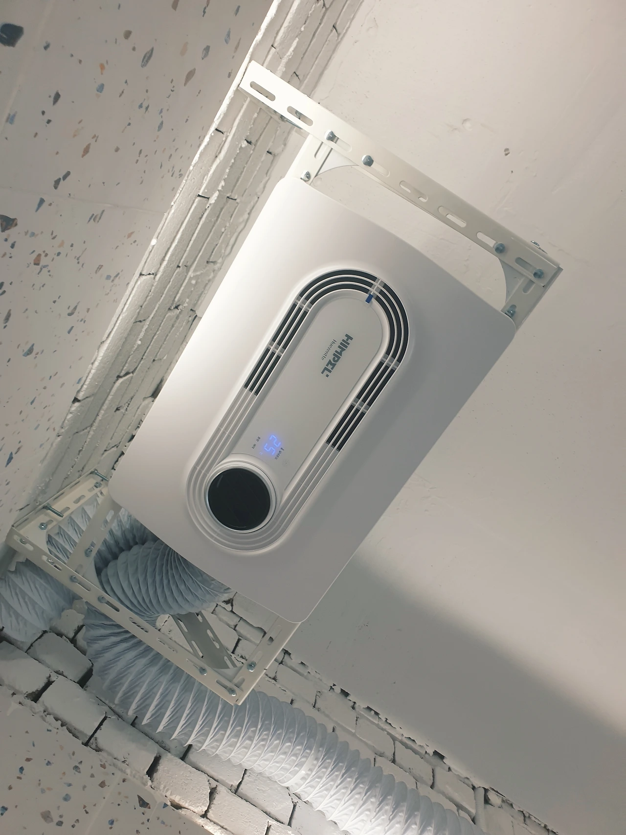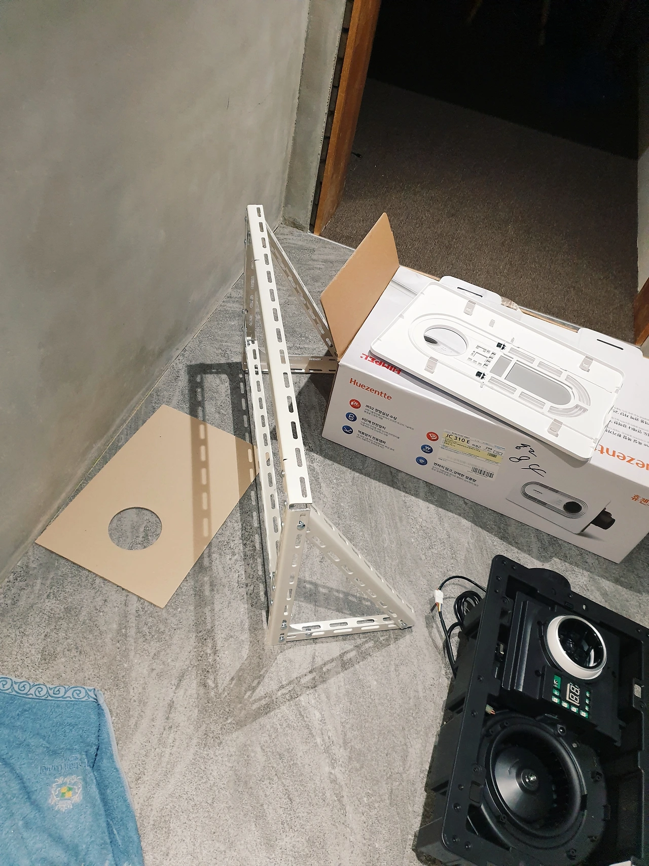환풍기가 없었기에, 벽을 뚫어서 배관을 설치할 구멍을 냈다. 겨울에 추위를 고려하여 고급 바디 드라이어와 온풍기 겸용의 환풍기를 구매했다.