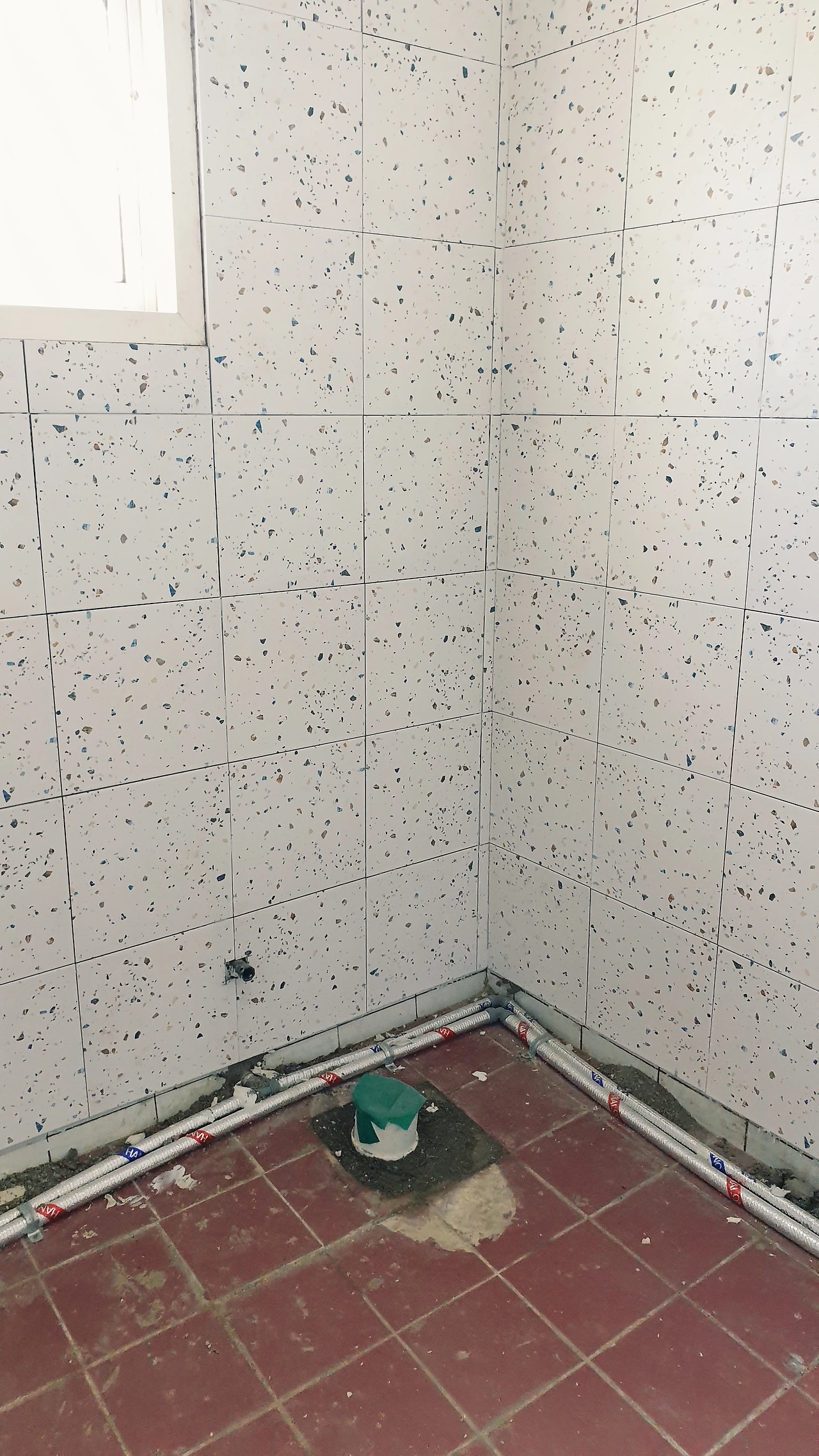 화장실 바닥 타일을 보통은 벽면과 다르게 어두운 색을 많이 한다. 지저분한 머리카락이라든지 이물질들이 잘 보이지 않게 하기 위해서다. 나는 그냥 모두 같은 타일을 썼다. 화장실이 거실보다 많이 낮게 있기에, 바닥을 철거하지 않고 몰탈을 채우고 기울기를 잡아서 타일을 붙이기로 했다. 기존에 세면대에 샤워기가 일체형식으로 있는 수전이었지만, 세변대와 분리해서 다른 위치에 설치하기 위해서 배관도 만들었다. 보일러 배관과 바닥 방통을 하면서 이부분은 배관 업체 사장님이 해주셨다.