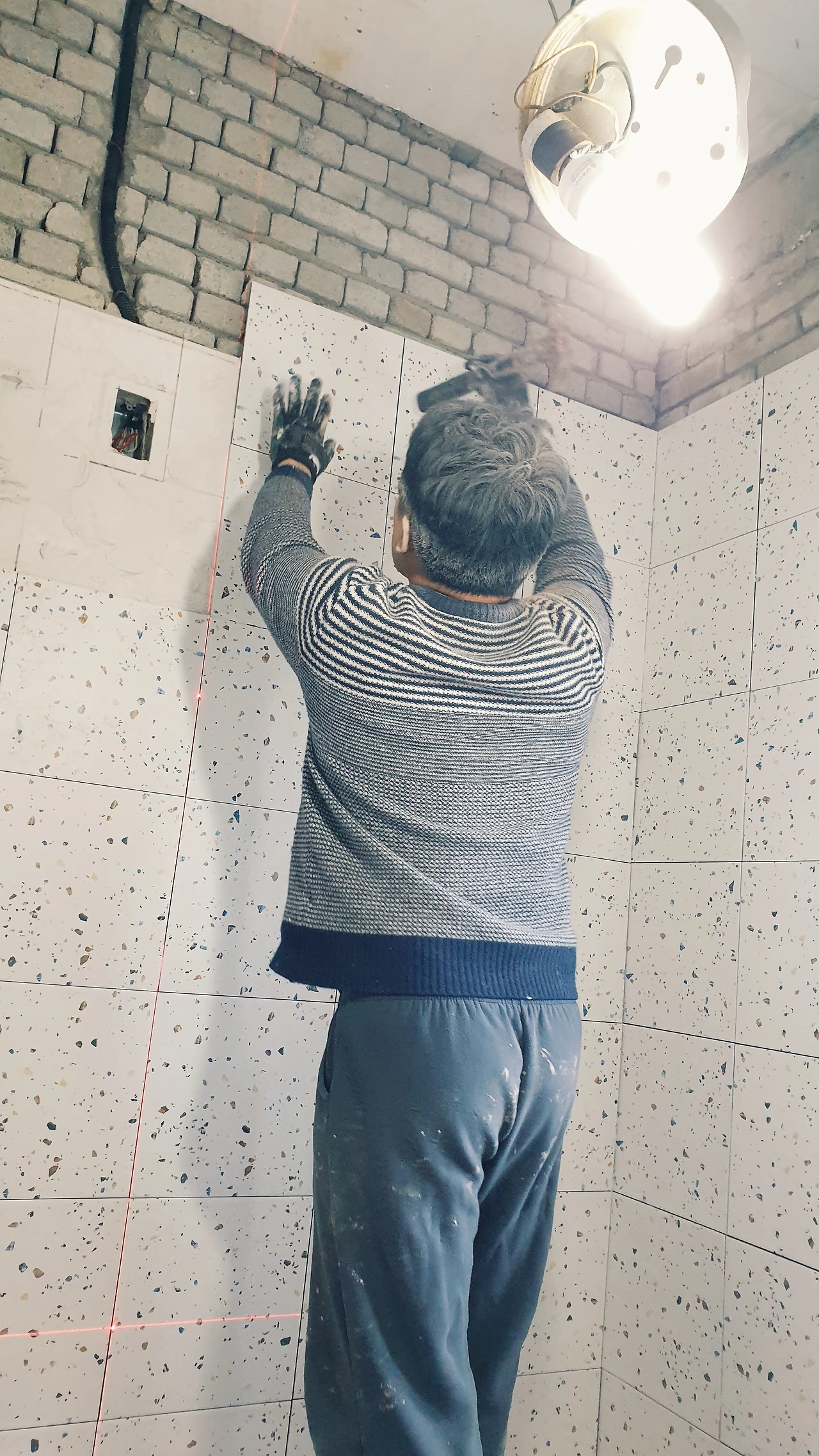 타일 시공은 이때가 두번째다. 세라픽스 본드로 고르게 바르고 타일을 잘 붙이면 된다. 타일 기술자들은 여러가지를 신경쓴다. 타일의 처음 시작점이 어딘지, 어떻게 어디서 짤리는지, 바닥 타일과 어떻게 만나는지, 타일 간격은 얼마나 띄울지, 그런 결정들이 마무새를 결정하고 기술적 마감의 세련됨을 결판낸다. 그냥 무턱대고 붙이기 시작하면 이렇게 되면 안되는데, 하는 순간이 온다. 그냥 돈주고 업자 부를껄 하는 순간이다.