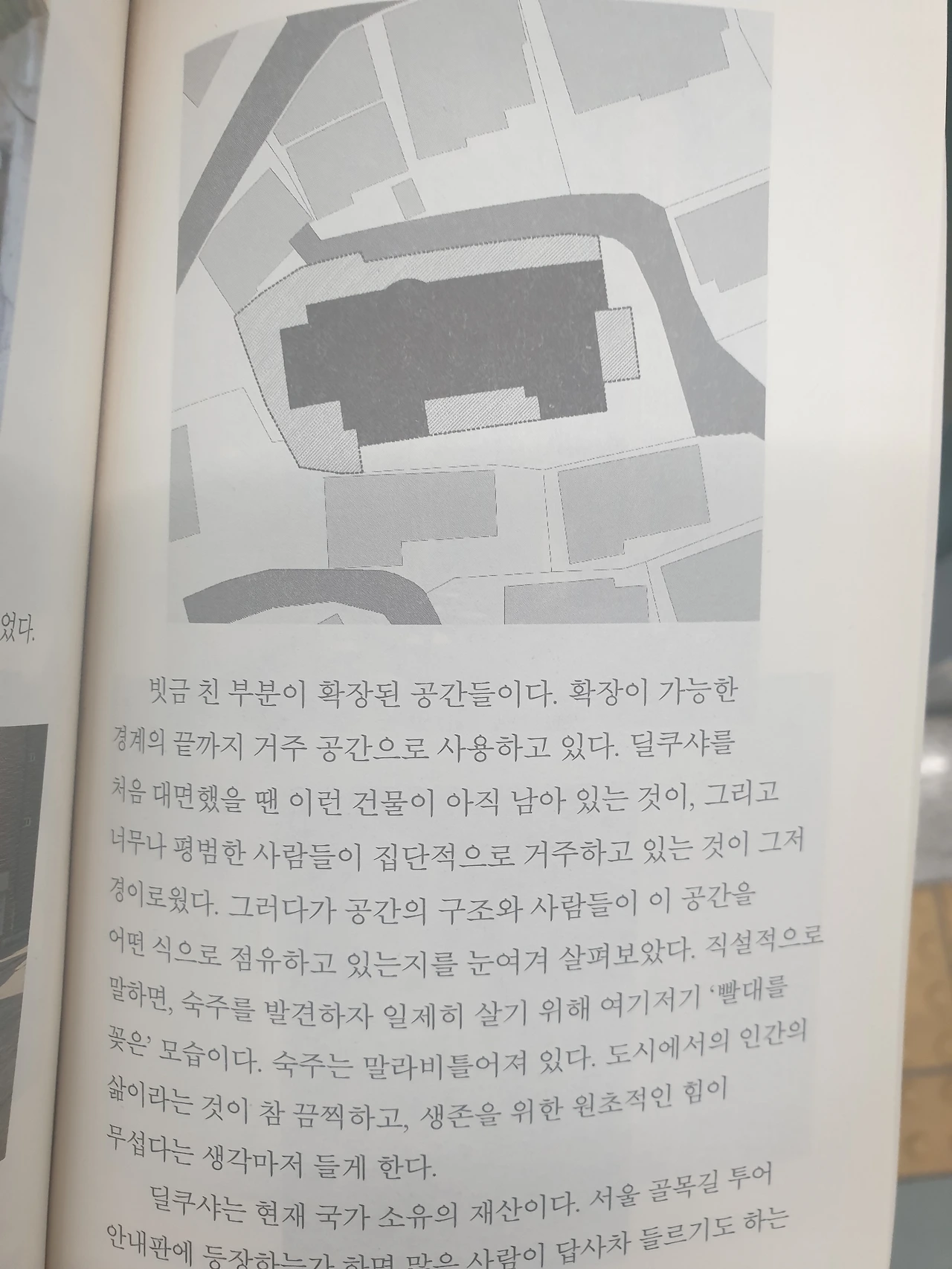 처음에 책은 공간에 대한 이야기를 주로 할 줄 알았는데, 책의 내용은 공간을 살아가는 사람들의 이야기다. 옛 건물안에 사는 사람들의 철학과 삶의 태도가 재미있다. 대부분 강북에 있는 지역들이다. 강남은 계획된 지역들이 많아 역사가 길지 않다. 그러나 강북에는 옛적부터 살아온 삶의 흔적이 개발해야 될 것으로 낙인 찍혀 때를 기다리고 있는 중이다. 책이 나온 시기는 꽤 지나서 이미 많이 변했다. 그래서 이 책을 읽으면서 옛날에는 이곳이 이랬구나를 비교하면서 읽어가는 재미가 있다.