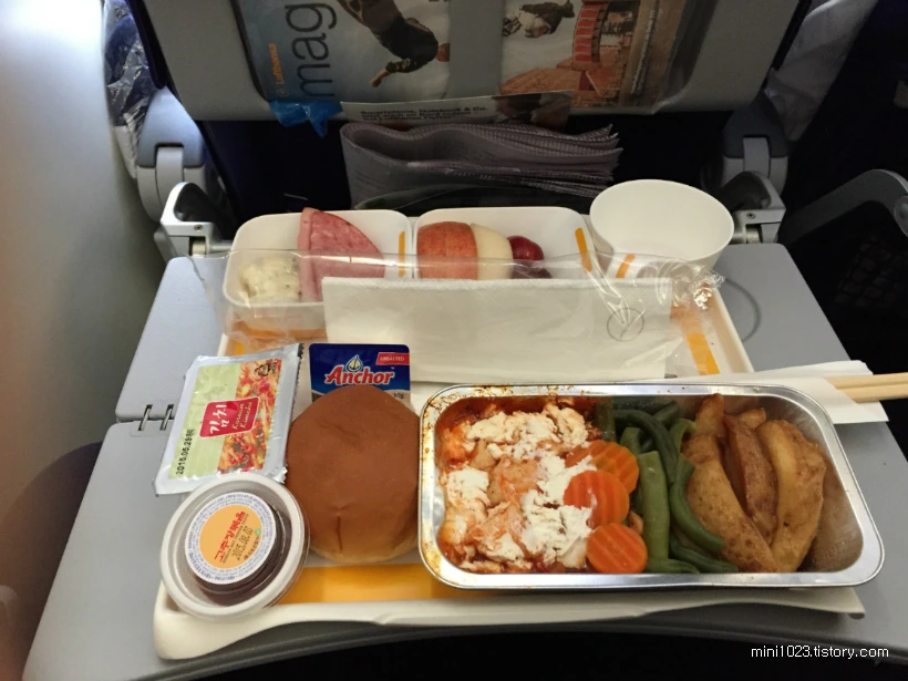 기내식은 서양식, 한국식 둘 중에 하나를 고를 수 있었다. 이제 막 한국을 떠난 지라 점심을 양식 메뉴로 골랐는데 김치랑 고추장이 같이 나왔다. 어울리지 않는 음식 조합이라 먹지 않고 보조가방에 따로 챙겼다. 그런데 김치 국물이 샜다. 잘 패킹 된 건 줄 알았는데... 망했다 젠장. ㅋㅋㅋㅋ 보조가방 바깥 주머니에서 이상(?)한 냄새가 났다. 아직 여행 시작도 안 했는데 보조가방에 김치 냄새가.. 어떡해! ㅋㅋㅋ 앞으로 음식 챙길 때 조심해야지 다짐했다.