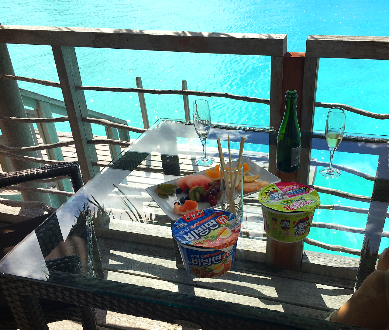그래서 우리가 선택한 방법은 조식을 많이, 정말 많이 먹는 것. 아침 겸 점심을 그렇게 많이 먹으면 저녁까지 버틸 수 있다. 중간에 배가 고프더라도 간단히 과자를 먹거나 라면을 먹으면 된다. 그래서 보라보라에 머문 5일 중 3일 저녁은 레스토랑에서 먹었지만 나머지는 한국에서 공수해온 컵라면, 햇반 등으로 일군 '한식의 날'로 채웠다.