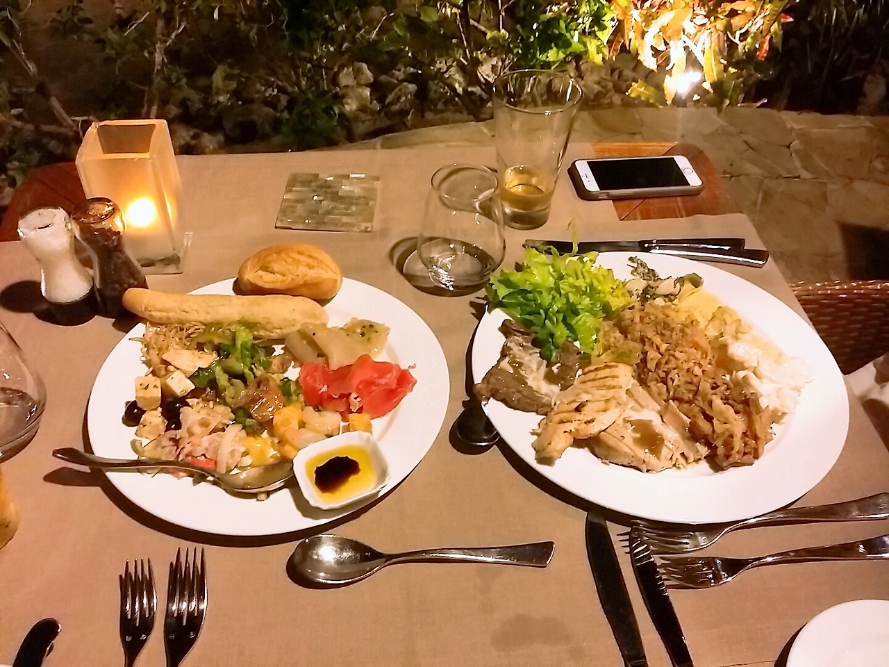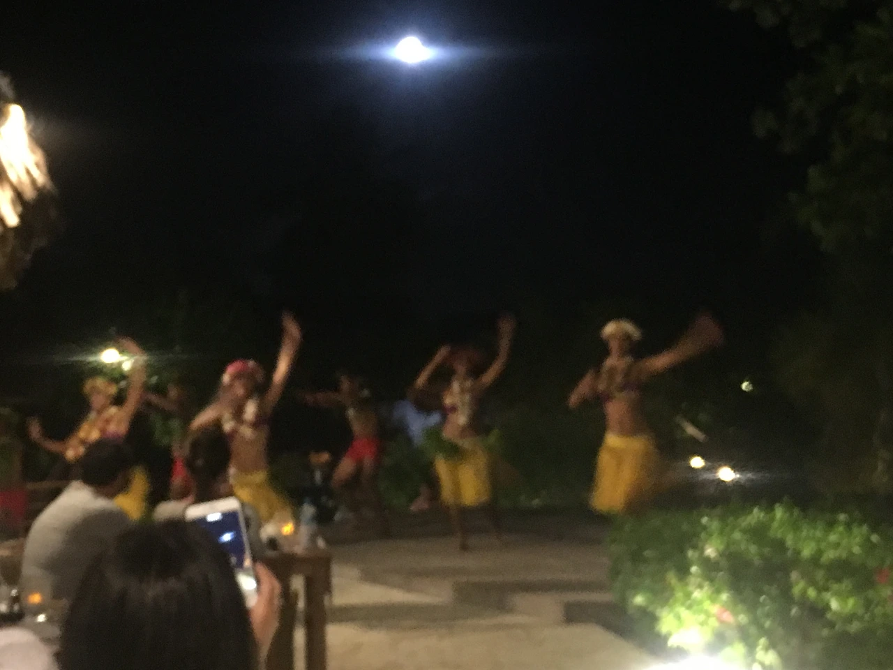 처음 보라보라를 도착하는 날 우리는 뷔페식 레스토랑인 테바 이로아 레스토랑 (Tevairoa Restaurant)에서 저녁을 즐겼다. 메뉴는 조식을 업그레이드해놓은 수준. 쇠고기, 닭고기를 이용한 다양한 요리와 신선한 회, 생선구이 등이 있었고, 빵과 케이크도 충분히 준비되어 있었다. 특히 저녁식사에는 타히티 전통 춤 공연이 포함되어 있었는데 무척 신명 났다.