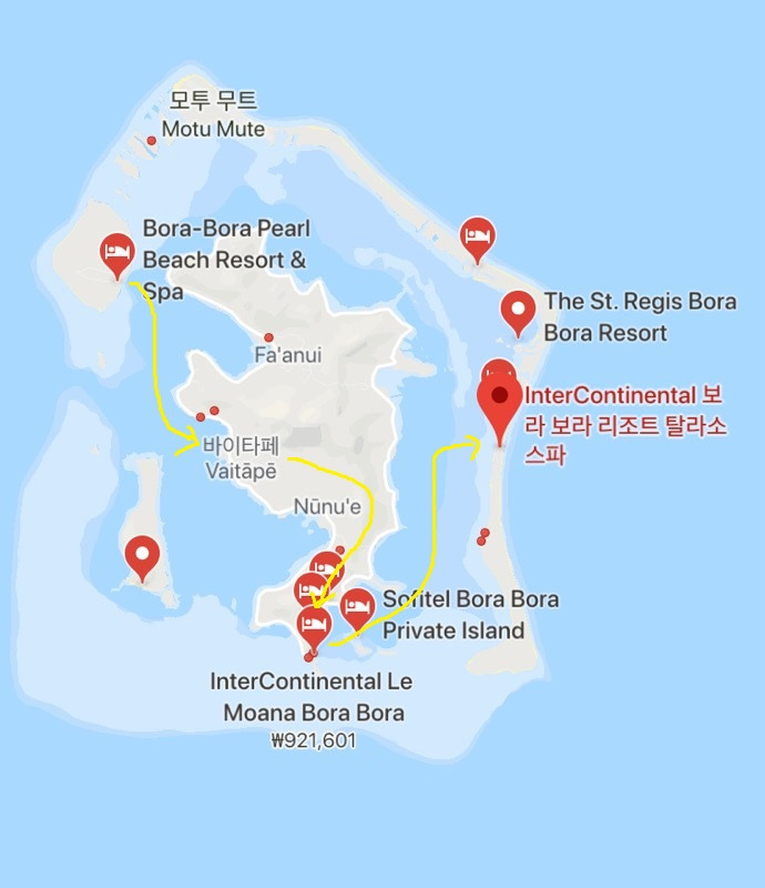 인터콘티넨탈 탈라소는 보라보라 섬의 동쪽에 있다. 이에 우리는 보라보라 펄 비치에서 수상보트를 타고 본섬 바이타페(Vaitape)로 간 후, 그곳에서 택시를 타고 섬의 남쪽에 자리한 인터콘티넨탈 르모아나(InterContinental Bora Bora Le Moana Resort)로 이동했다. 이곳에서 수상 셔틀을 타고 탈라소로 도착했다.