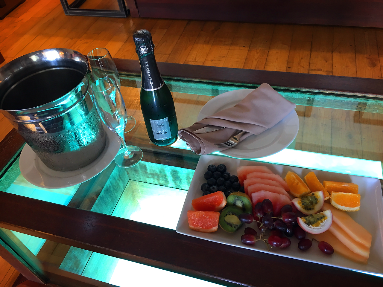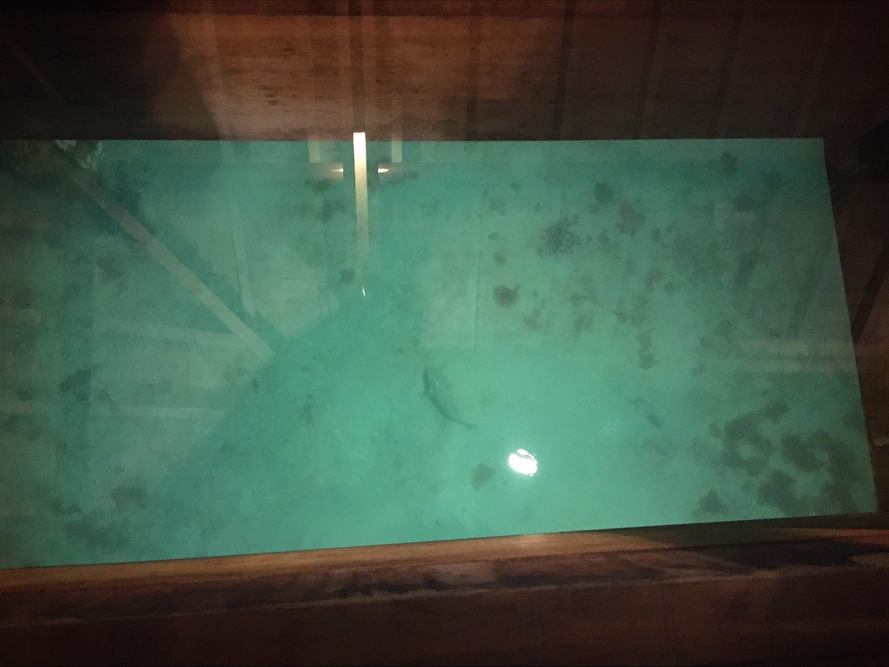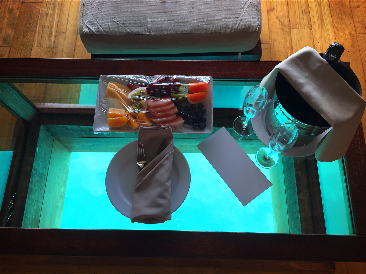 설레는 마음으로 숙소 현관을 열어보니 그토록 궁금했던 물고기가 지나가는 투명 테이블이 눈에 들어왔다. 그 위엔 허니문 웰컴 드링크와 간단한 과일 등이 마련되어 있었다. (사전 예약 시 고를 수 있는데 과일, 스낵, 케이크 등 중 원하는 것을 고르면 된다.) 예상보다 물속에 물고기가 많지 않아서 물고기가 득실득실 보이는 건 아니었지만 밤엔 커다란 물고기들이 등장해 즐거움을 주곤 했다.