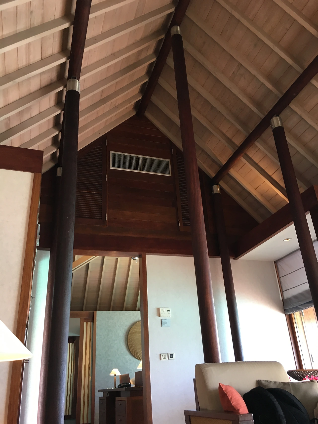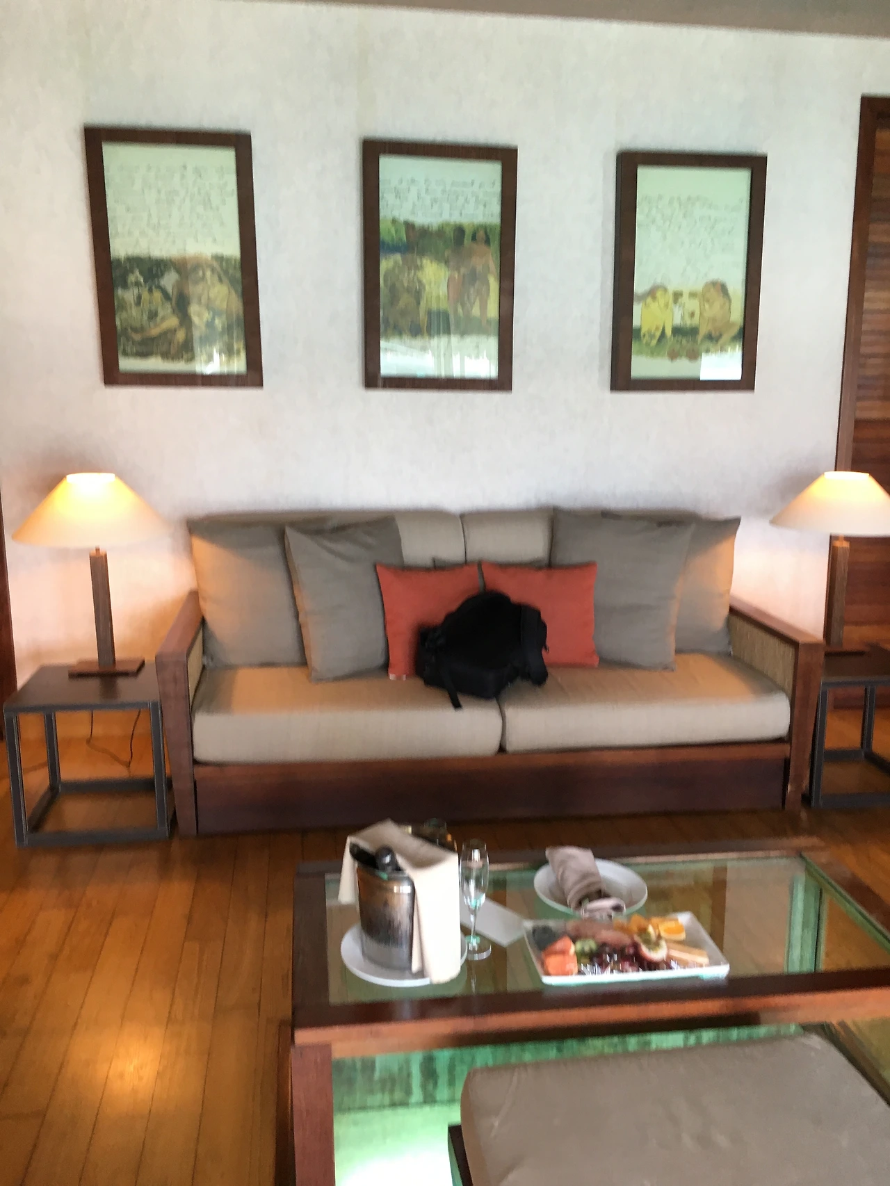 우리가 묵은 숙소는 사파이어 오버워터 빌라(Sapphire Overwater Villa). 탈라소 오버워터 빌라 중 에메랄드-사파이어-다이아몬드 오버워터 빌라는 룸 컨디션은 동일한데 오테마누 뷰가 방안에서도 한눈에 보이는가, 방 밖에서 보이는 가 등의 차이에 따라 가격이 달랐다. 우리 방은 발코니로 나오면 오테마누 산이 한눈에 보이는 곳이었다.