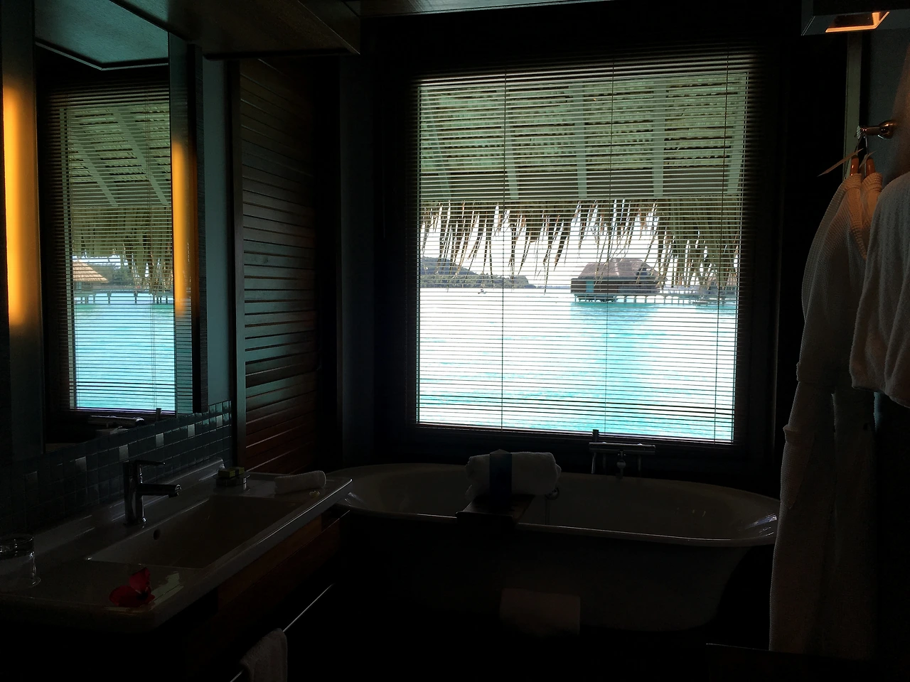 침대 역시 슈퍼킹 사이즈로 크고 탄탄했다. 한 번 누우면 일어나기 싫을 정도로 편안해 푹 잘 수 있었고 발아래는 보라보라의 맑은 바다를 한눈에 볼 수 있게끔 큰 창이 놓여 있었다. 욕실 역시 넓고 쾌적했다. 특히 욕조 옆에 창이 있어서 보라보라 해변을 보면서 따뜻한 물에 몸을 담글 수 있었다.
